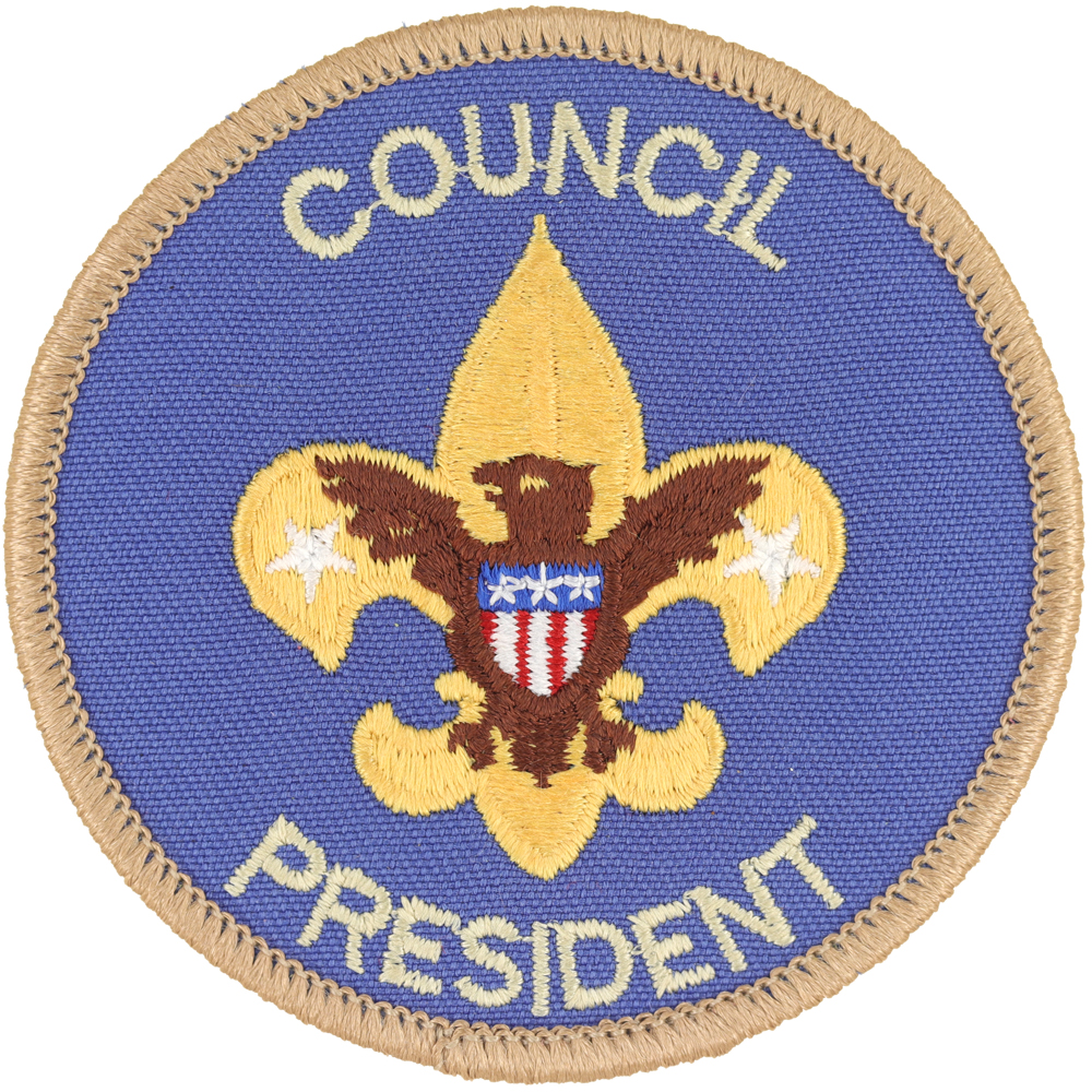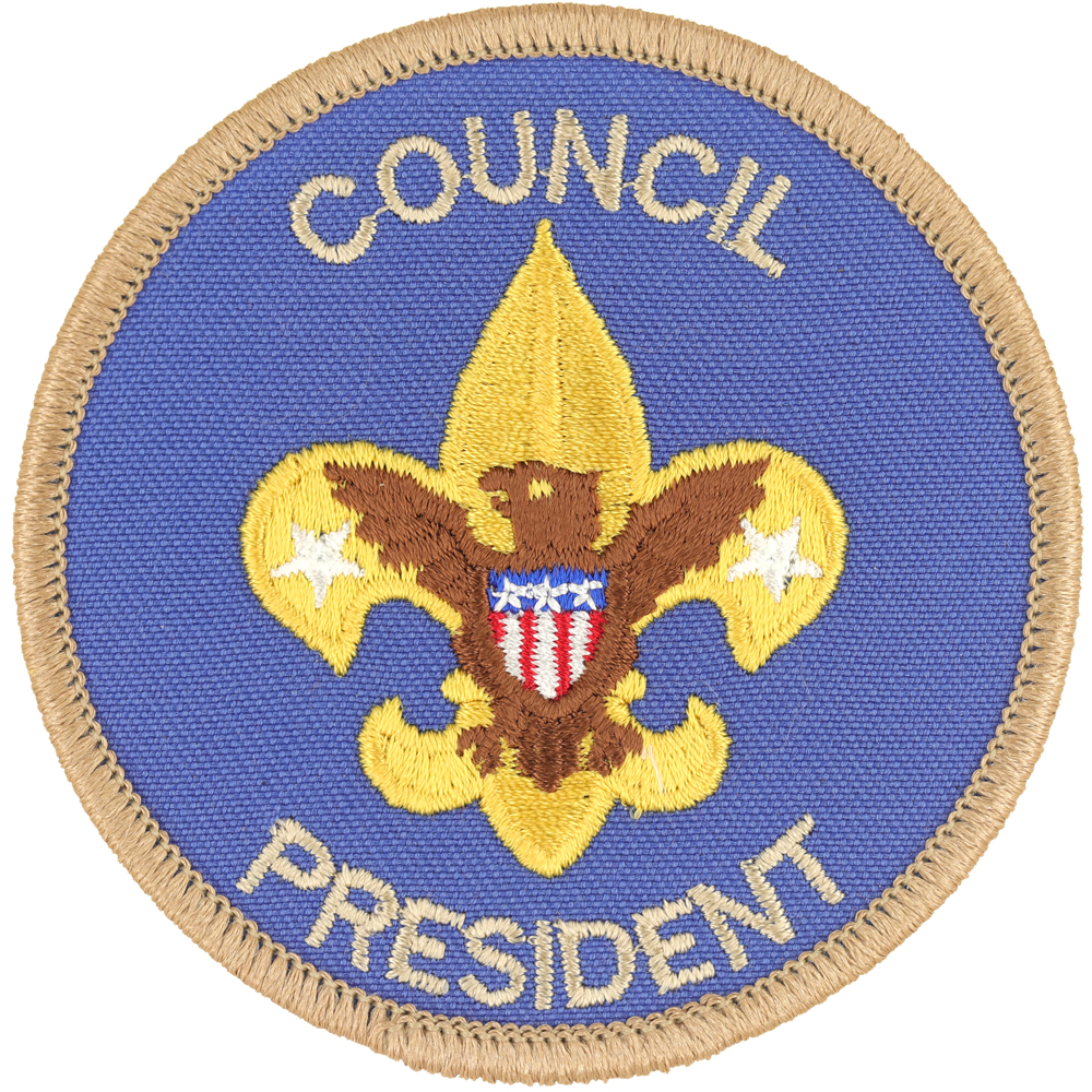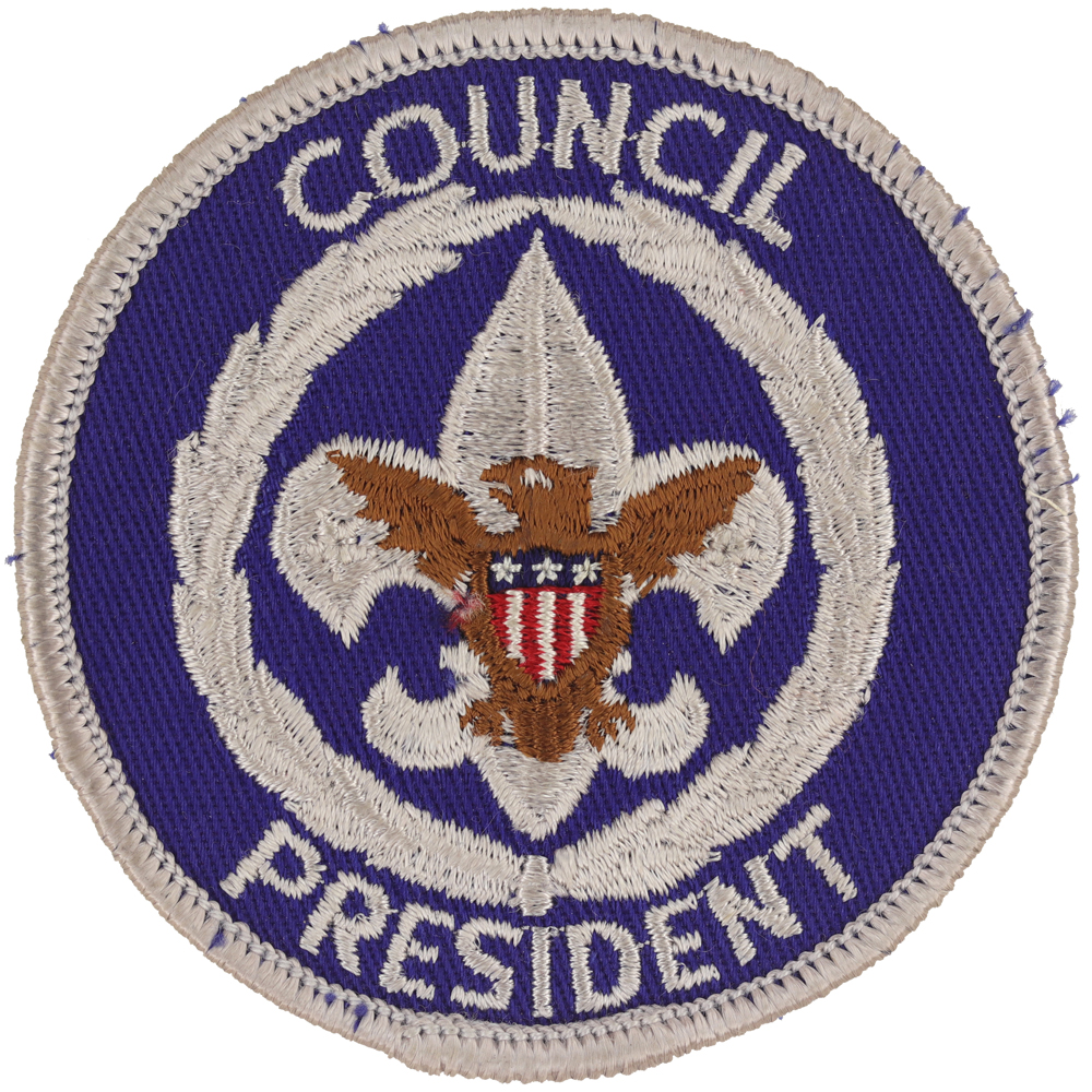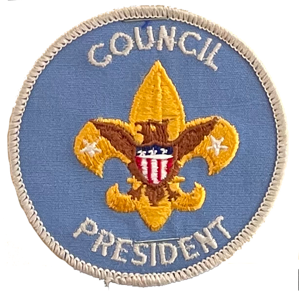 - Design: Silver wreath, silver Tenderfoot emblem with brown eagle, silver border, silver "COUNCIL PRESIDENT"