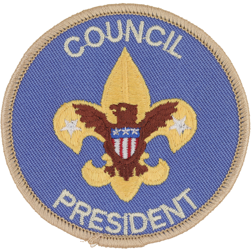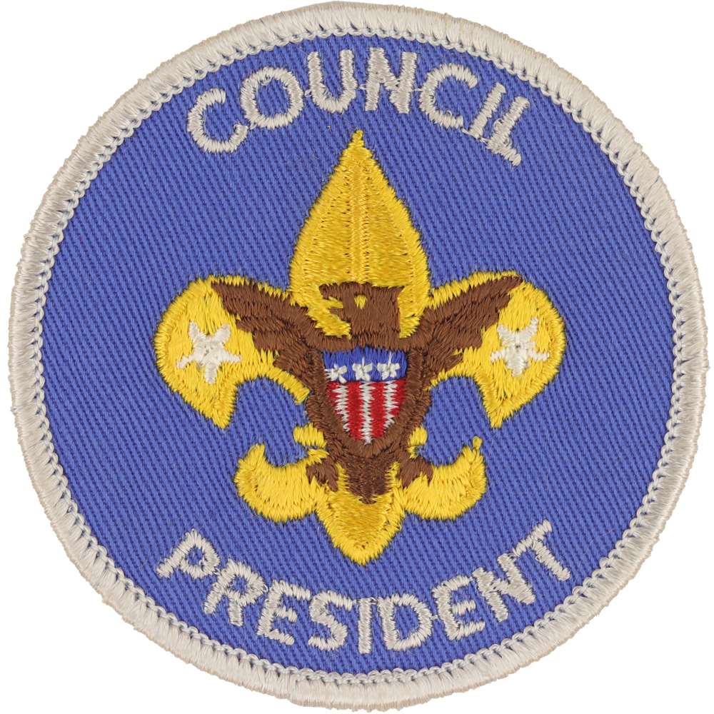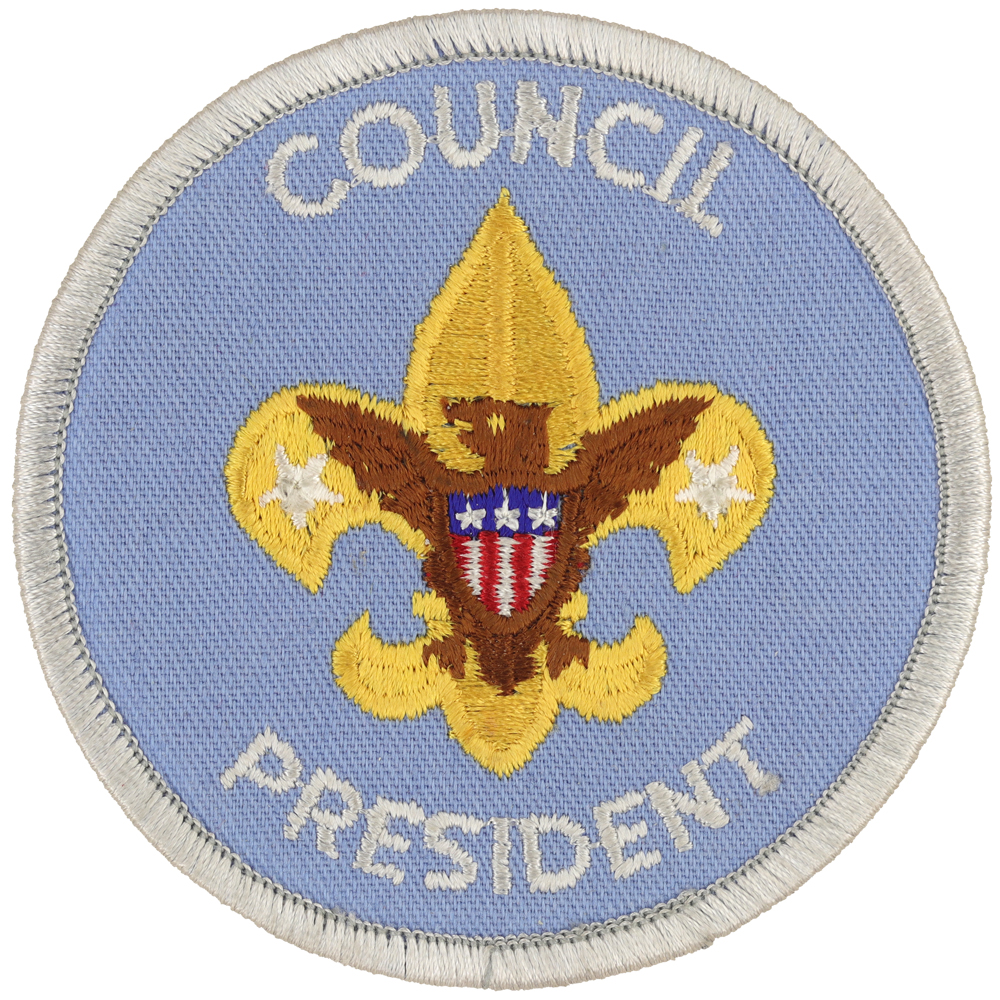 - Design: Silver wreath, silver Tenderfoot emblem with brown eagle, silver border, silver "COUNCIL PRESIDENT"