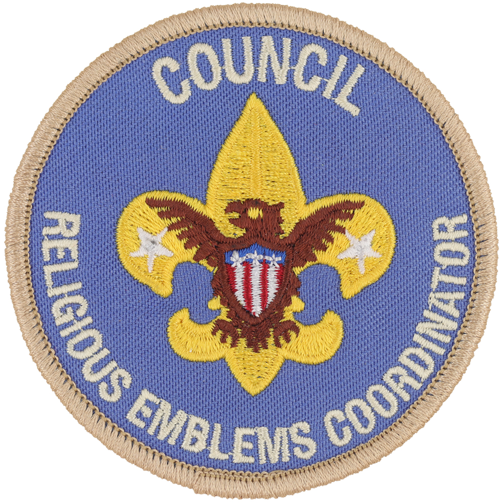 - Design: Gold Tenderfoot emblem with brown eagle, light brown border and almond lettering "COUNCIL RELIGIOUS EMBLEMS COORDINATOR"