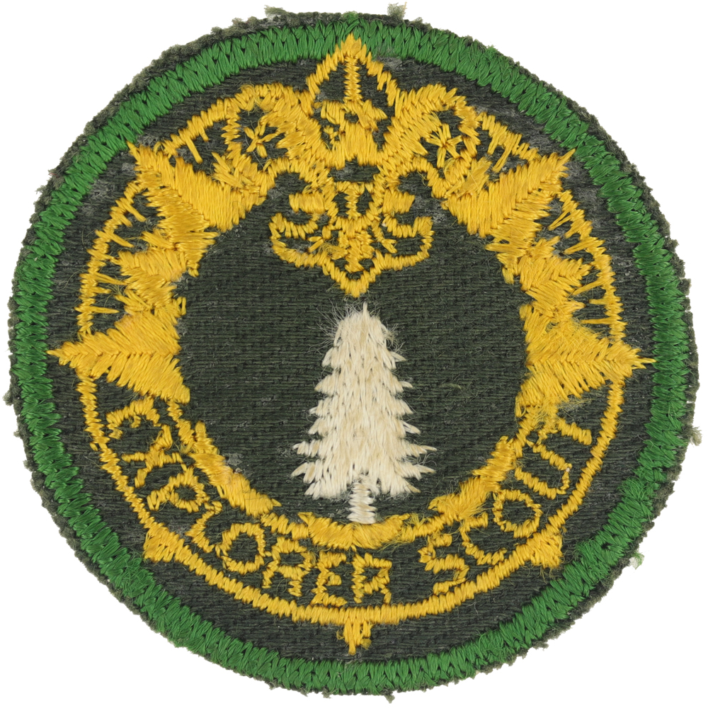 - Design: Light green border, gold compass ring, gold Tenderfoot emblem and gold "EXPLORER SCOUT", white tree in center