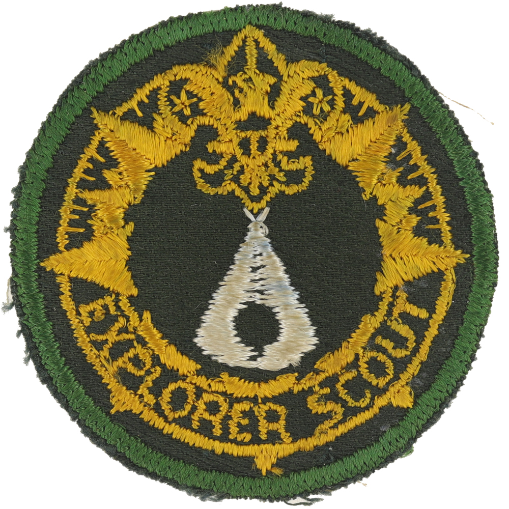 - Design: Light green border, gold compass ring, gold Tenderfoot emblem and gold "EXPLORER SCOUT", white tepee in center