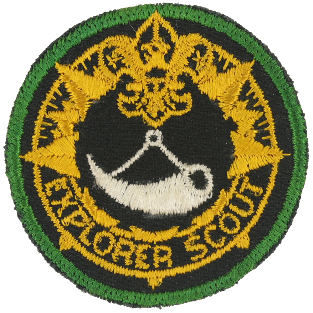 - Design: Light green border, gold compass ring, gold Tenderfoot emblem and gold "EXPLORER SCOUT", white powder horn in center