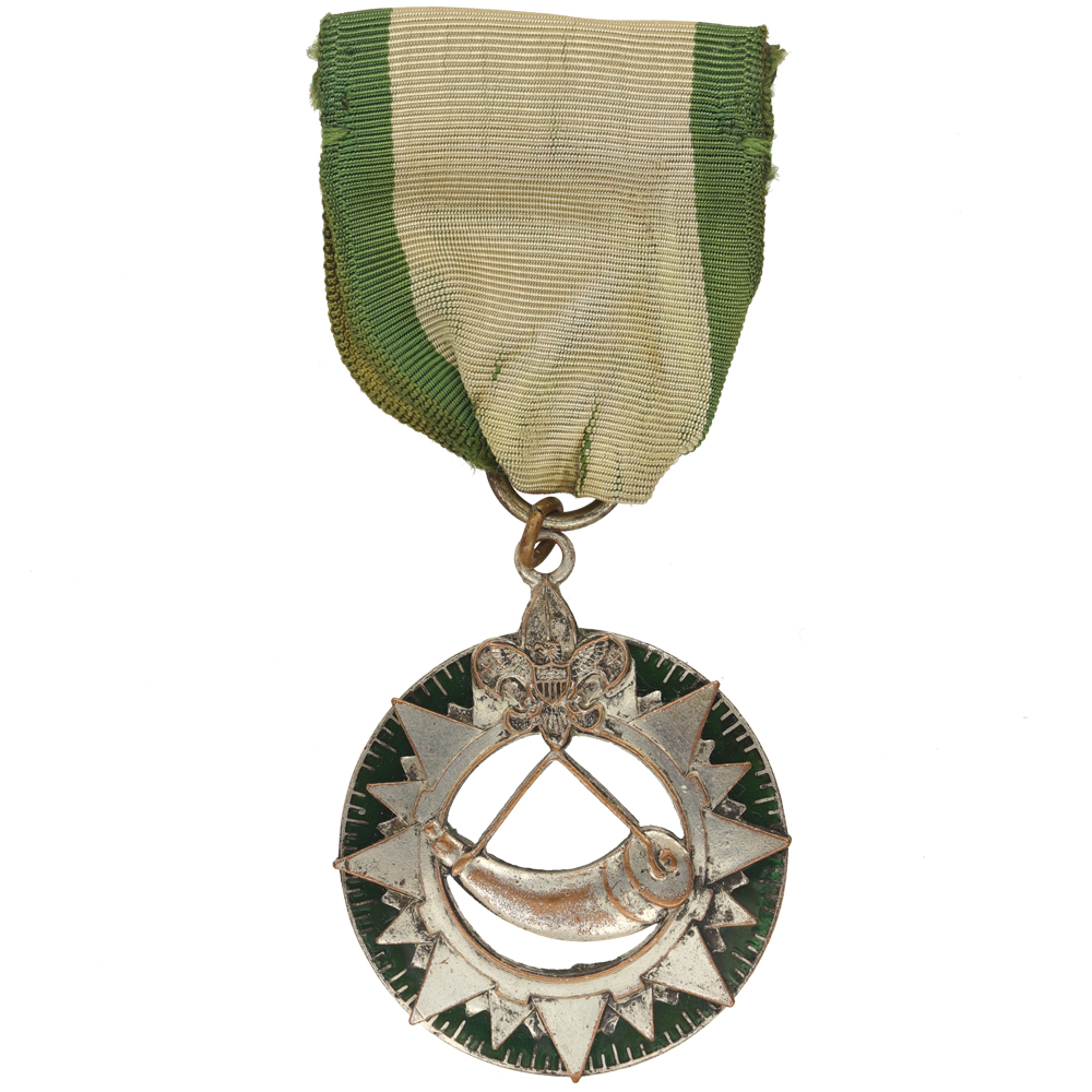 - Design: Compass ring with green enamel, silver Tenderfoot with silver powder horn hanging from Tenderfoot emblem