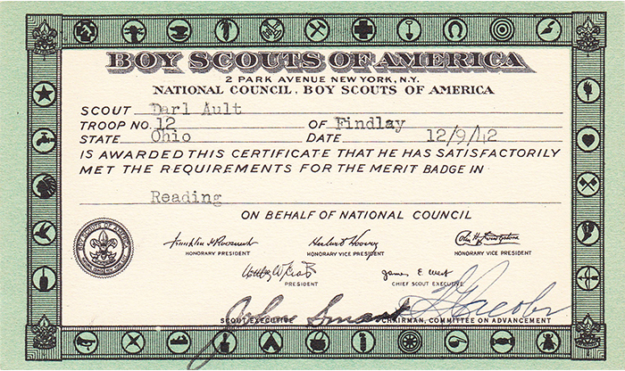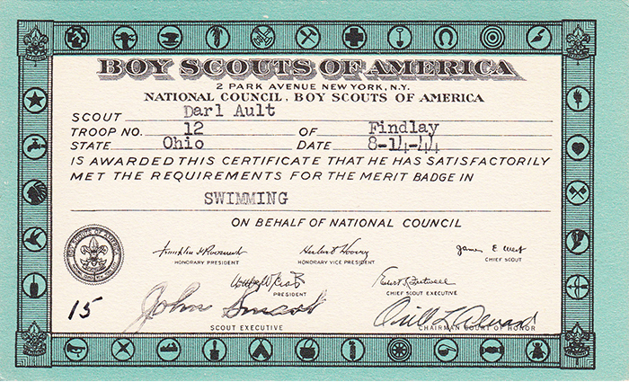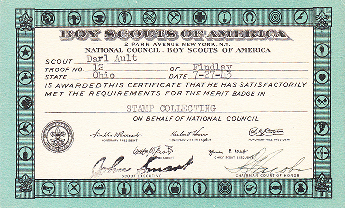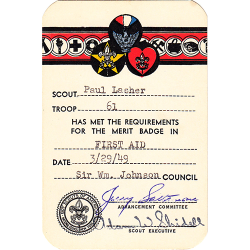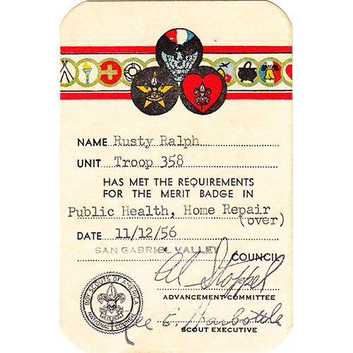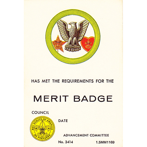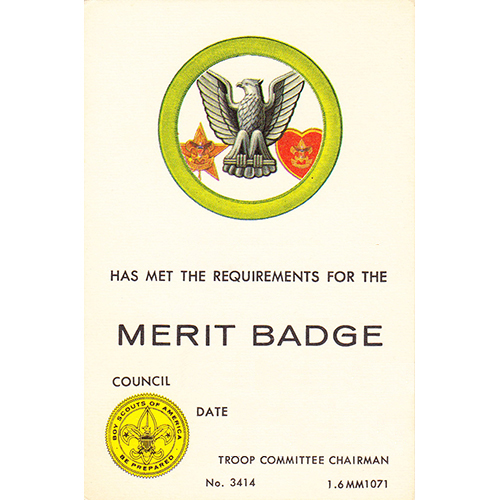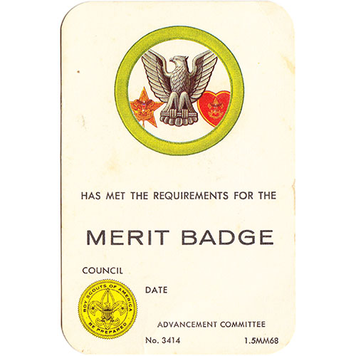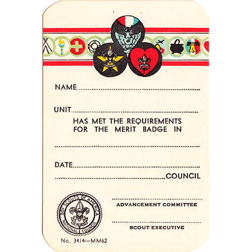 - Special: Dotted line on date line extends across card, black and White merit badge emblems, red behind merit badges