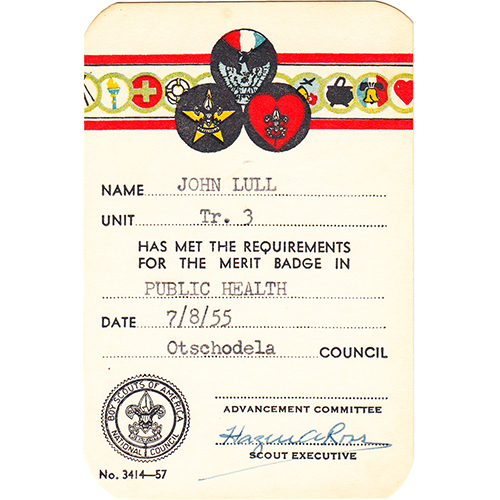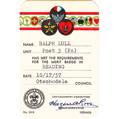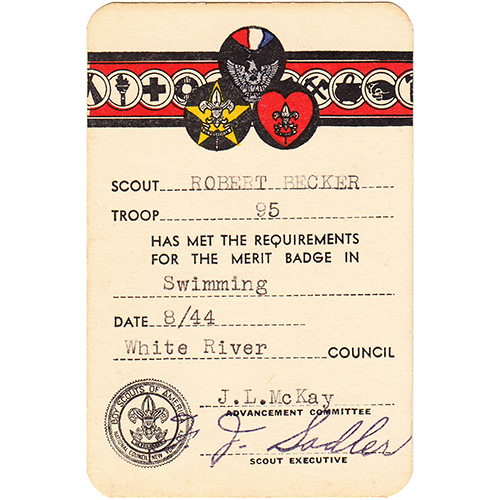 - Special: Dotted line on date line does not extend across card, black and White merit badge emblems, red behind merit badges