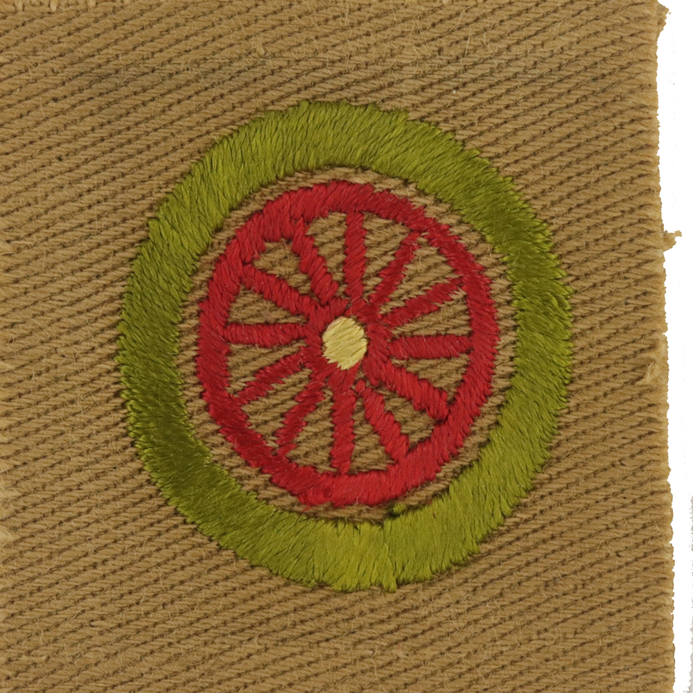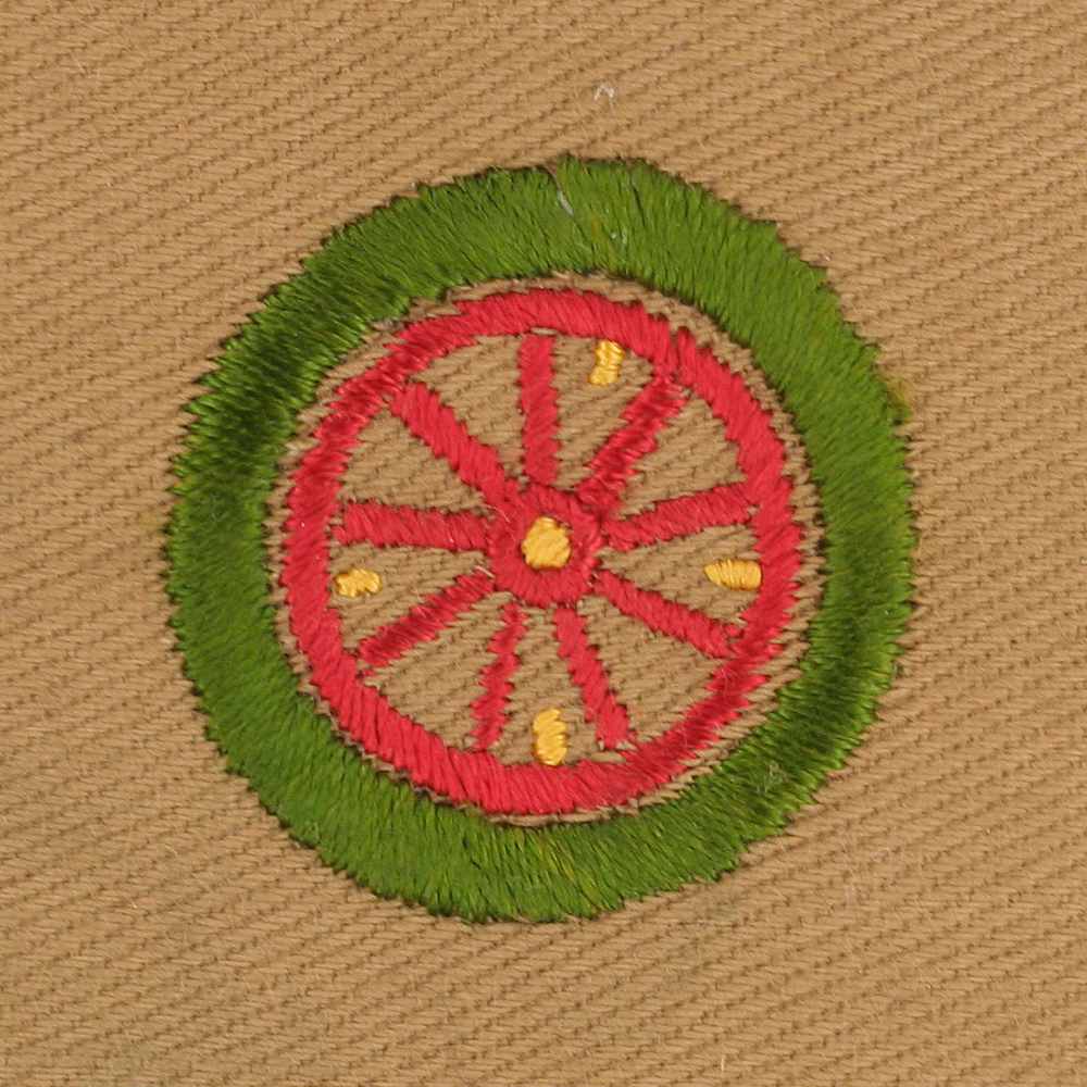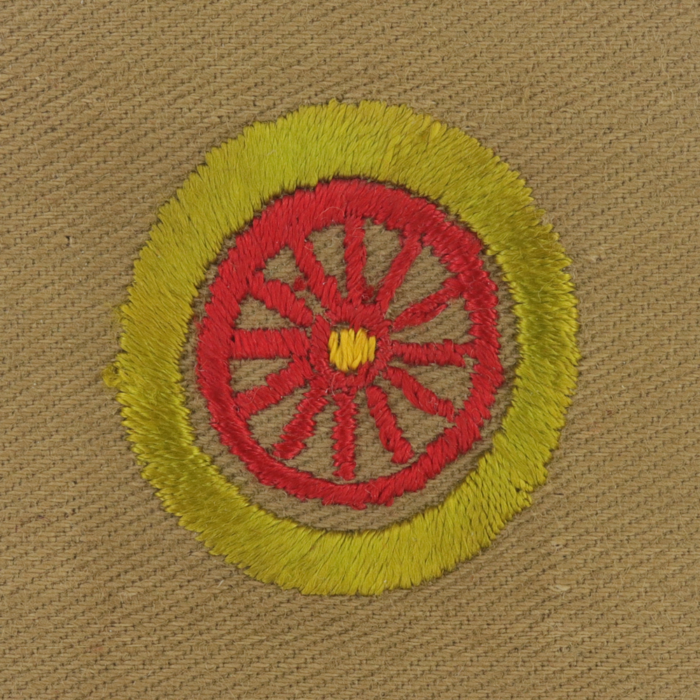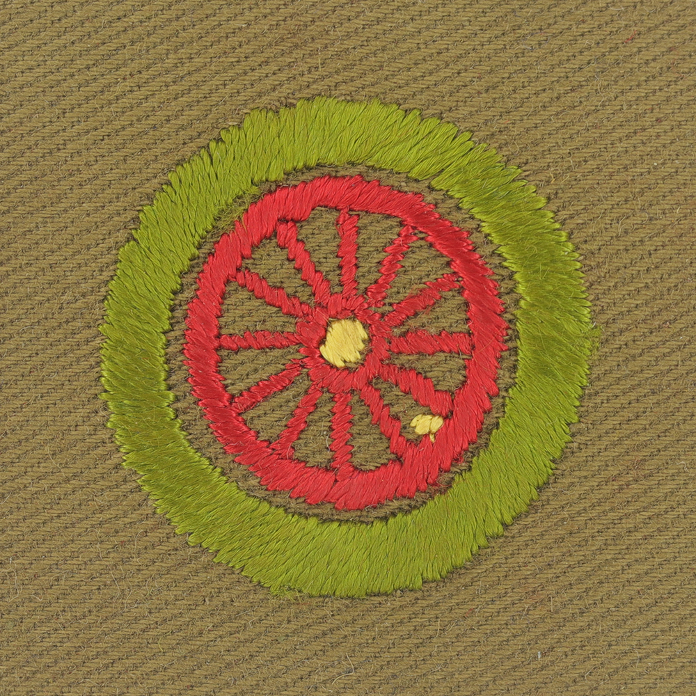 - Design: Red wheel touches green border, nine spokes, four valves, three spokes between valves upper right, center yellow embroidery parallel to spoke with NO valve on either side