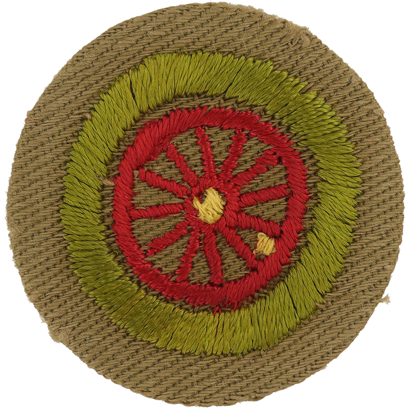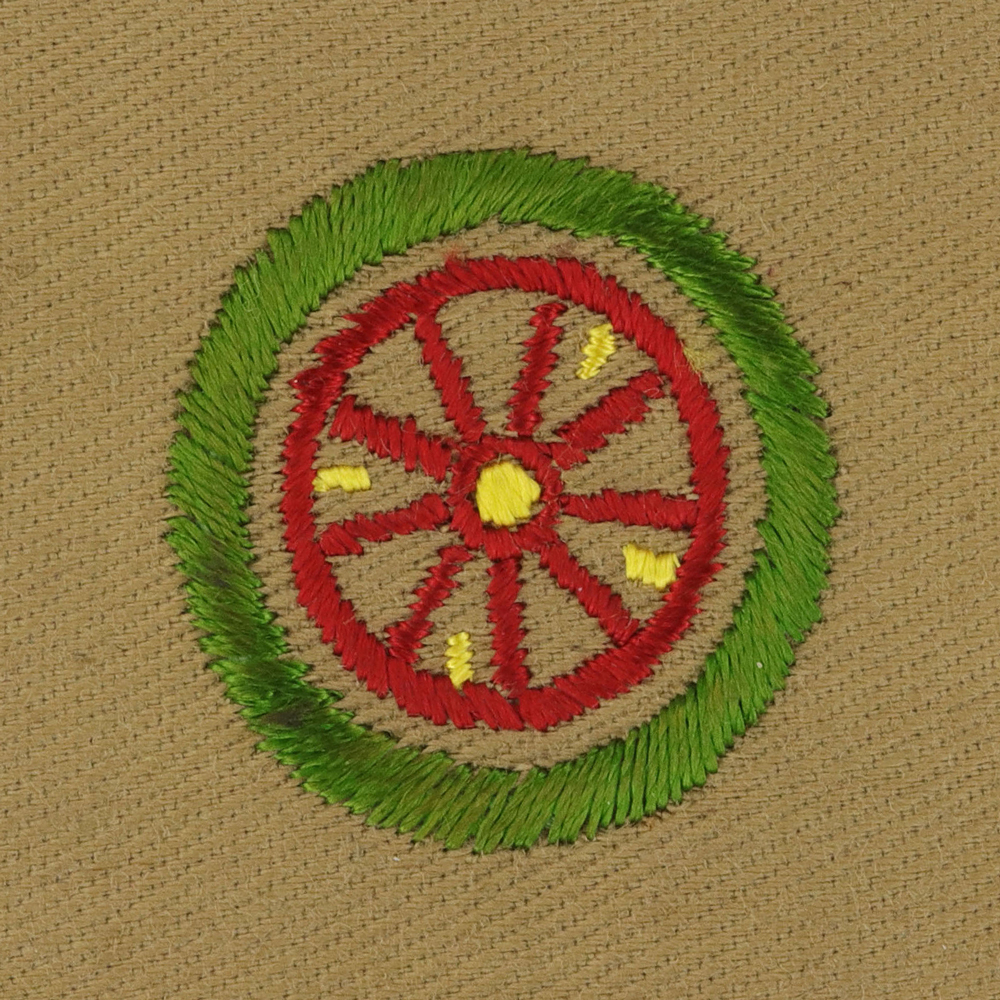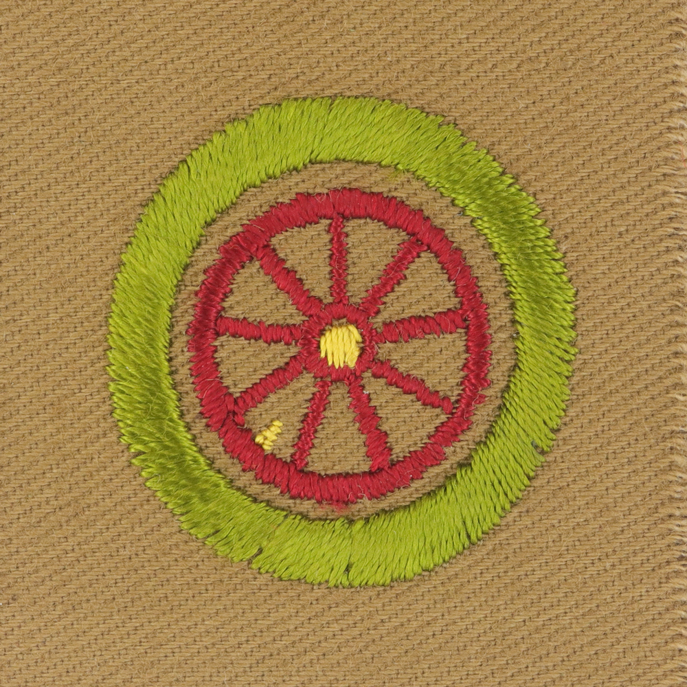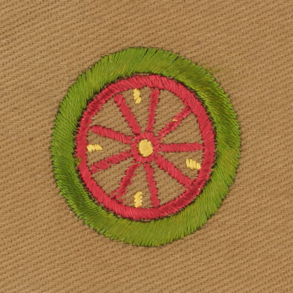 - Design: Red wheel touches green border, nine spokes, four valves, three spokes between valves upper right, center yellow embroidery parallel to spoke with NO valve on either side