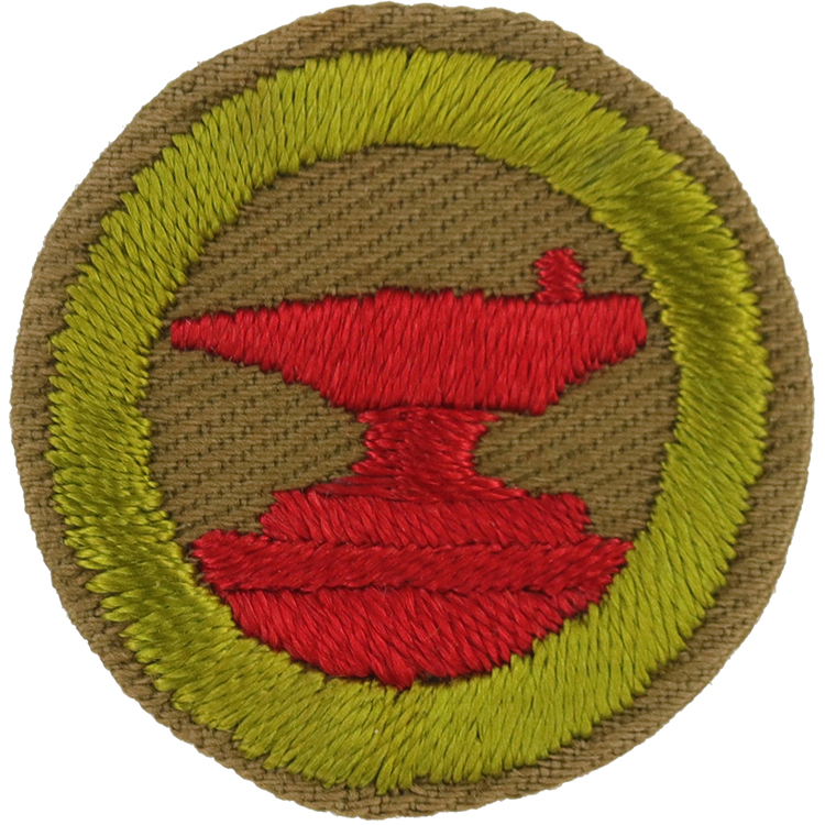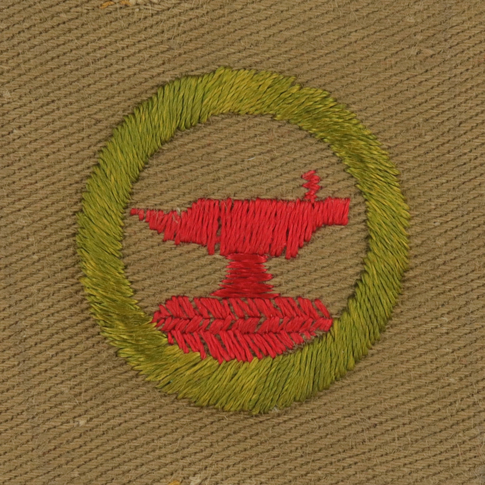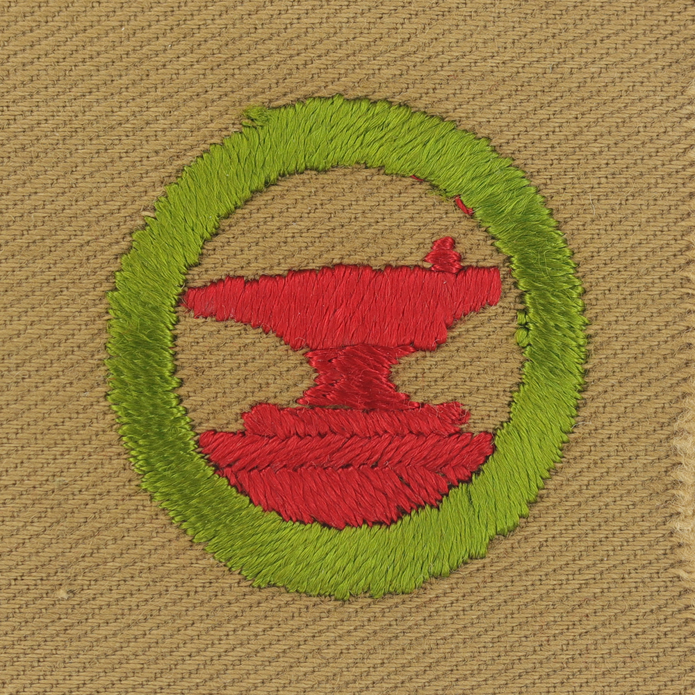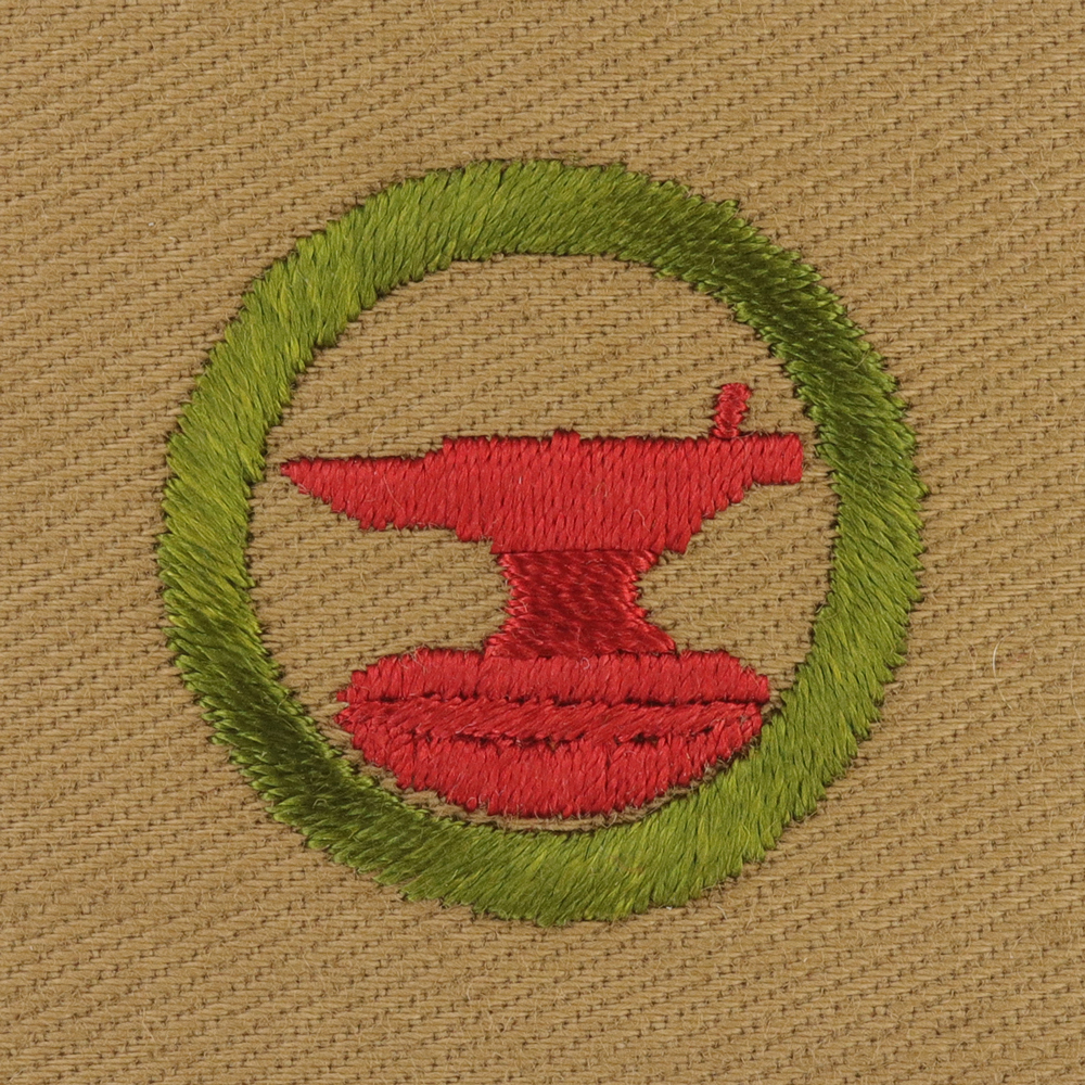 - Design: 3 layer base of anvil, top and lower layer of base embroidery angled to left, center angled to right, long pointed horn