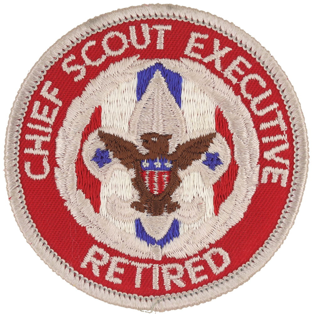 - Design: Silver tenderfoot emblem with brown eagle, red-white-blue-white-red behind Tenderfoot emblem, silver wreath and silver lettering "CHIEF SCOUT EXECUTIVE RETIRED"