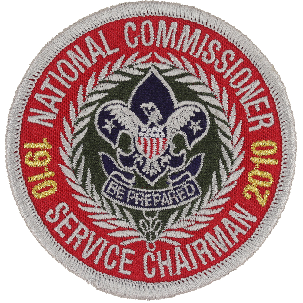 - Design: Blue First Class emblem with gray outline, wreath, and gray lettering "NATIONAL CO mmISSIONER SERVICE CHAIRMAN", gold mylar "1910 2010"