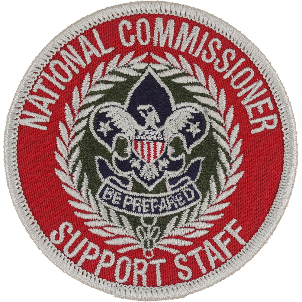 - Design: Gray tenderfoot emblem with brown eagle, gray wreath, and gray lettering "NATIONAL CO mmISSIONER SUPPORT STAFF"