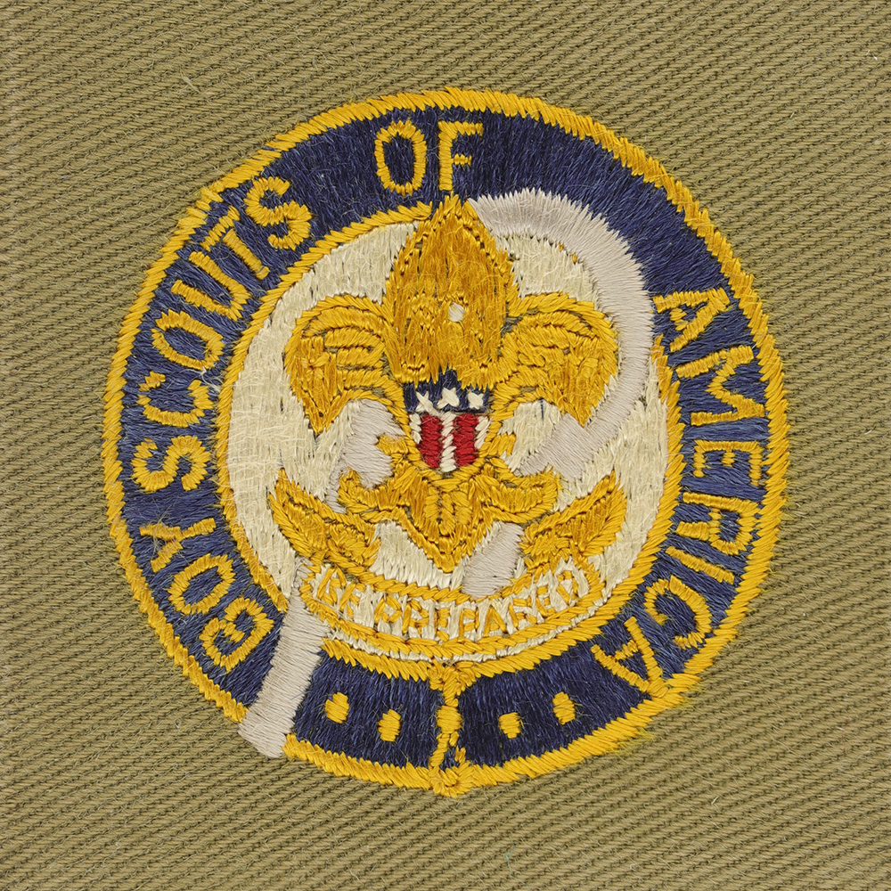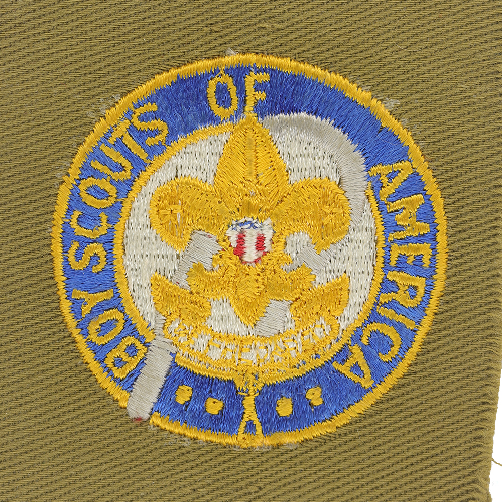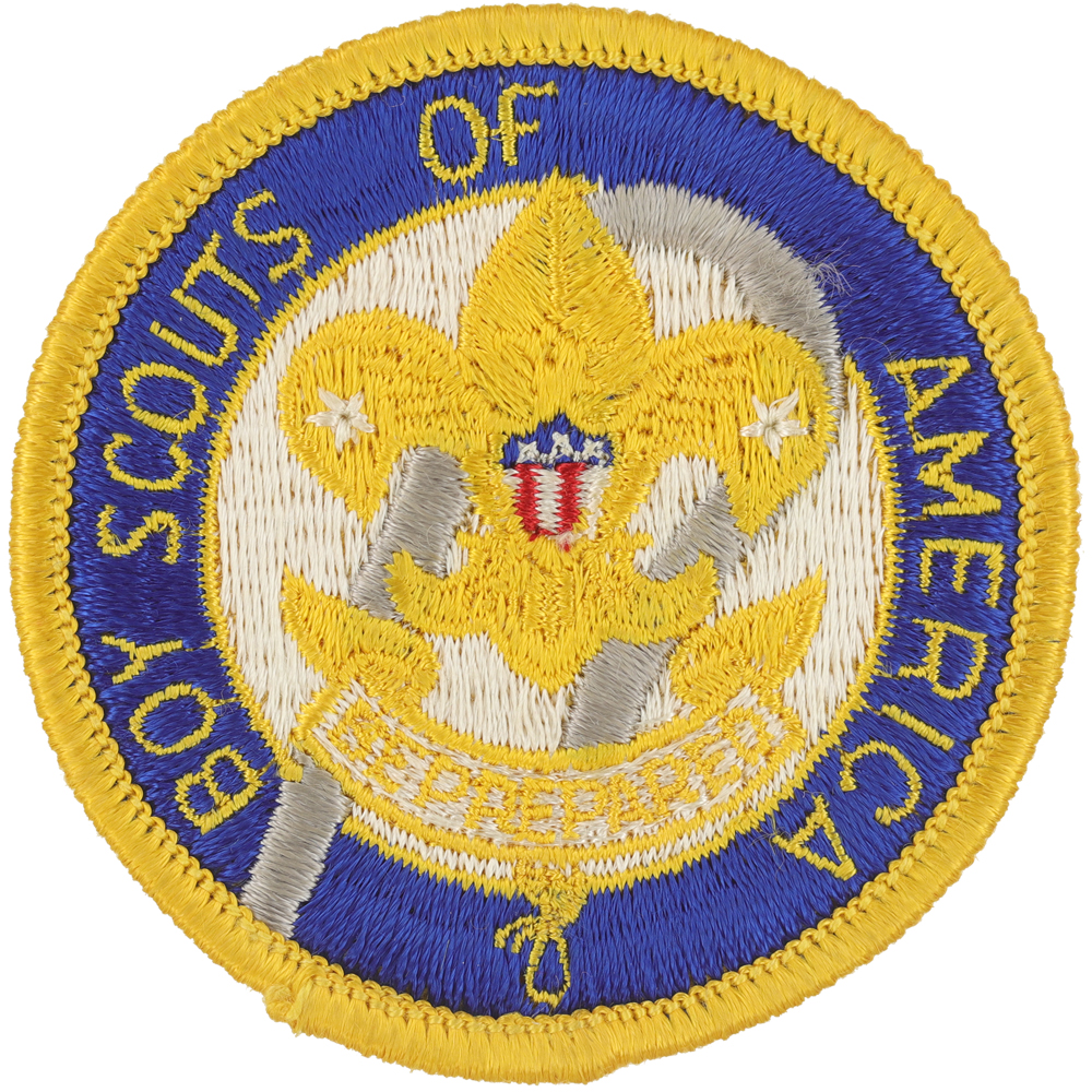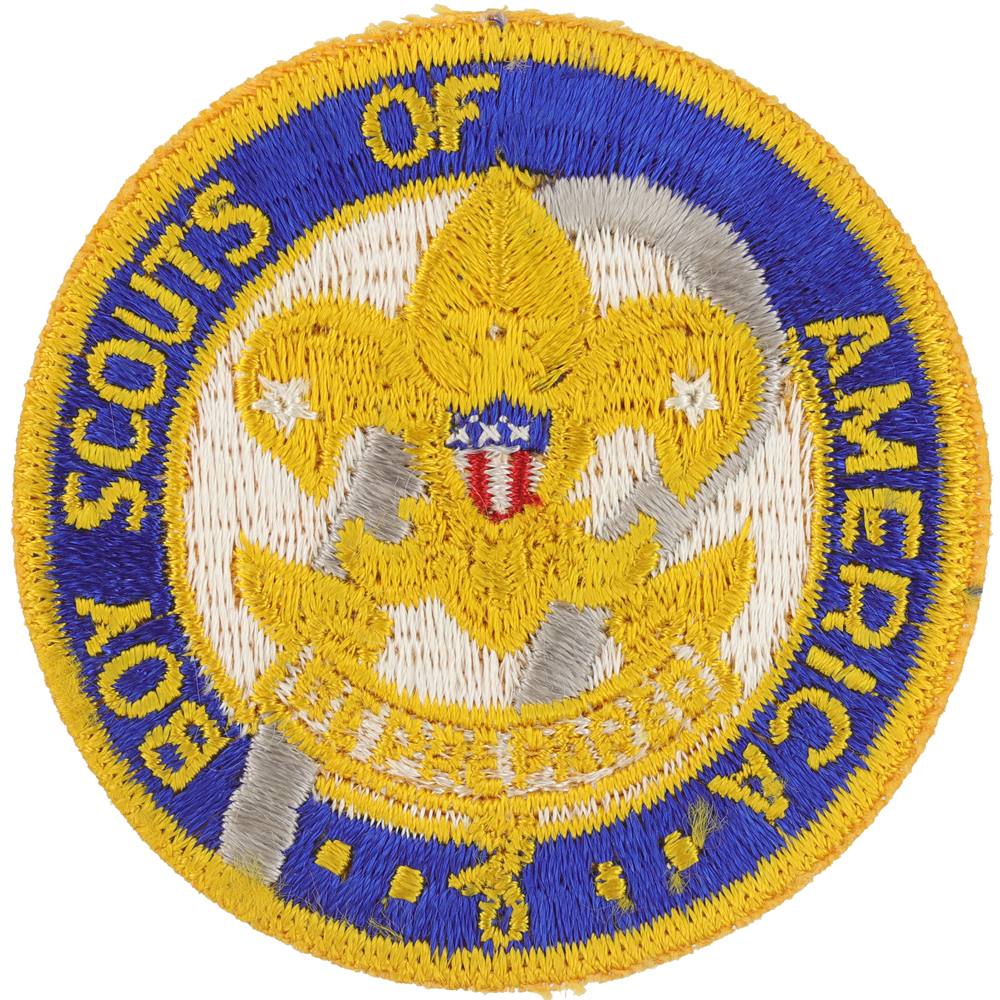 - Design: Gold First Class emblem with white behind emblem, silver shpherd's crook, gold border and lettering "BOY SCOUTS OF AMERICA", dark blue behind letters