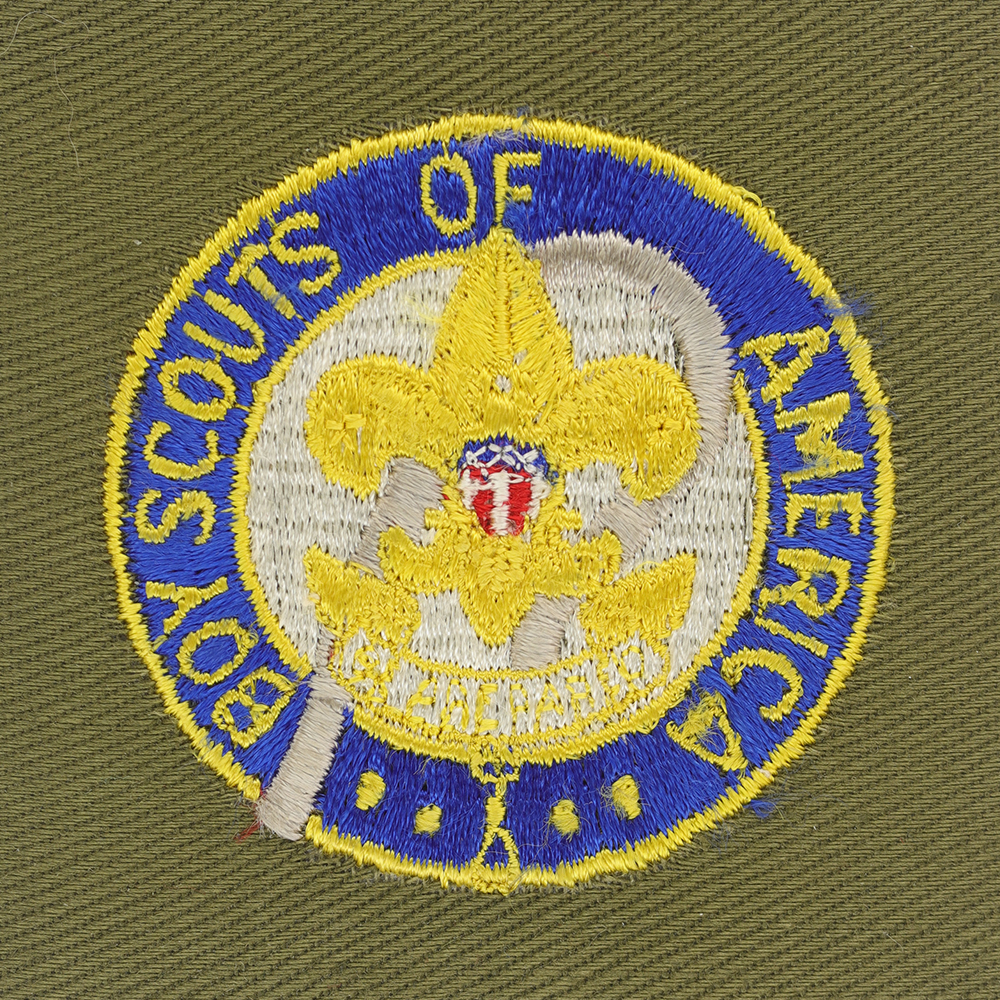 - Design: Gold First Class emblem with white behind emblem, silver shpherd's crook, gold border and lettering "BOY SCOUTS OF AMERICA", blue behind letters