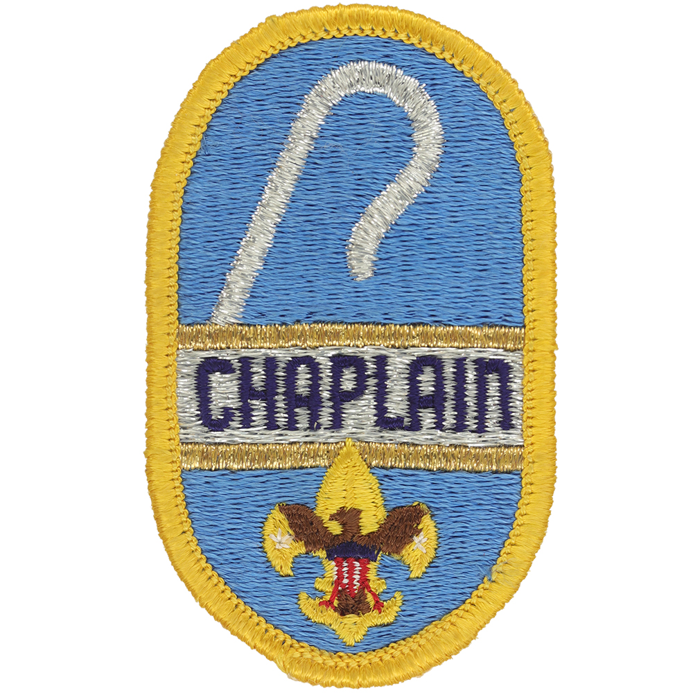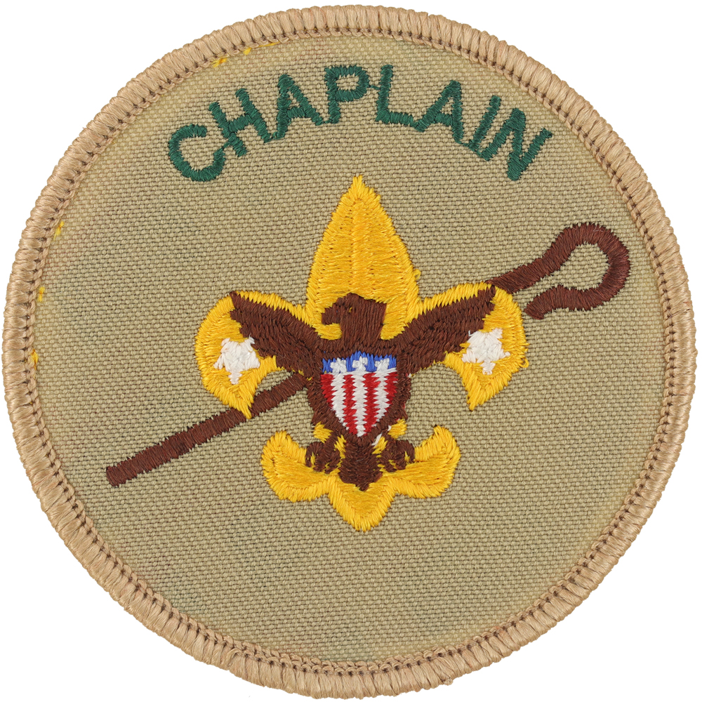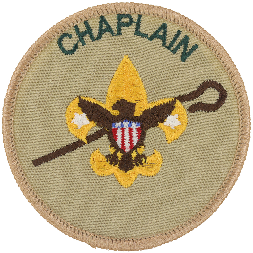 - Design: Gold Tenderfoot emblem with brown eagle, brown shepherd's crook, tan border, green lettering "CHAPLAIN"
