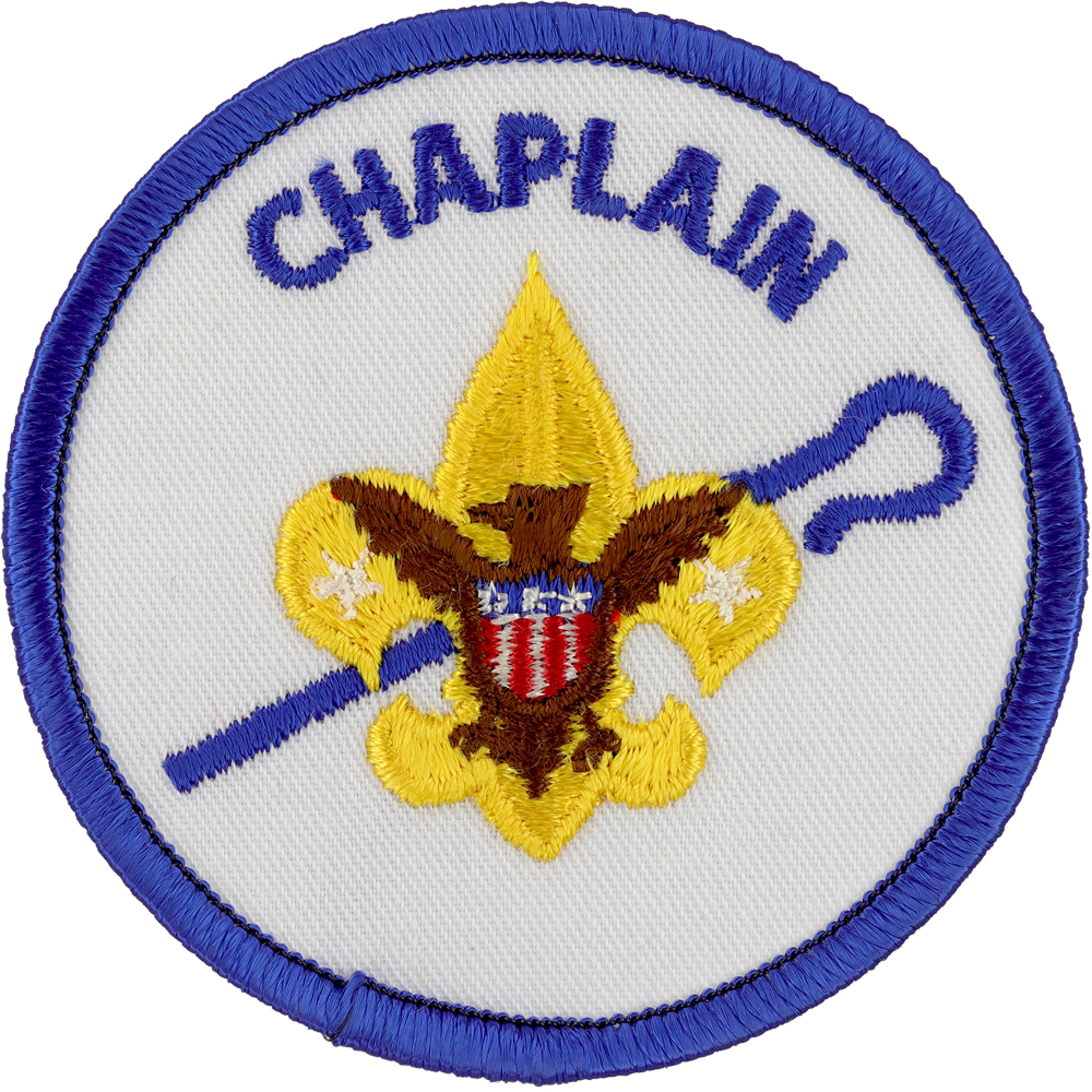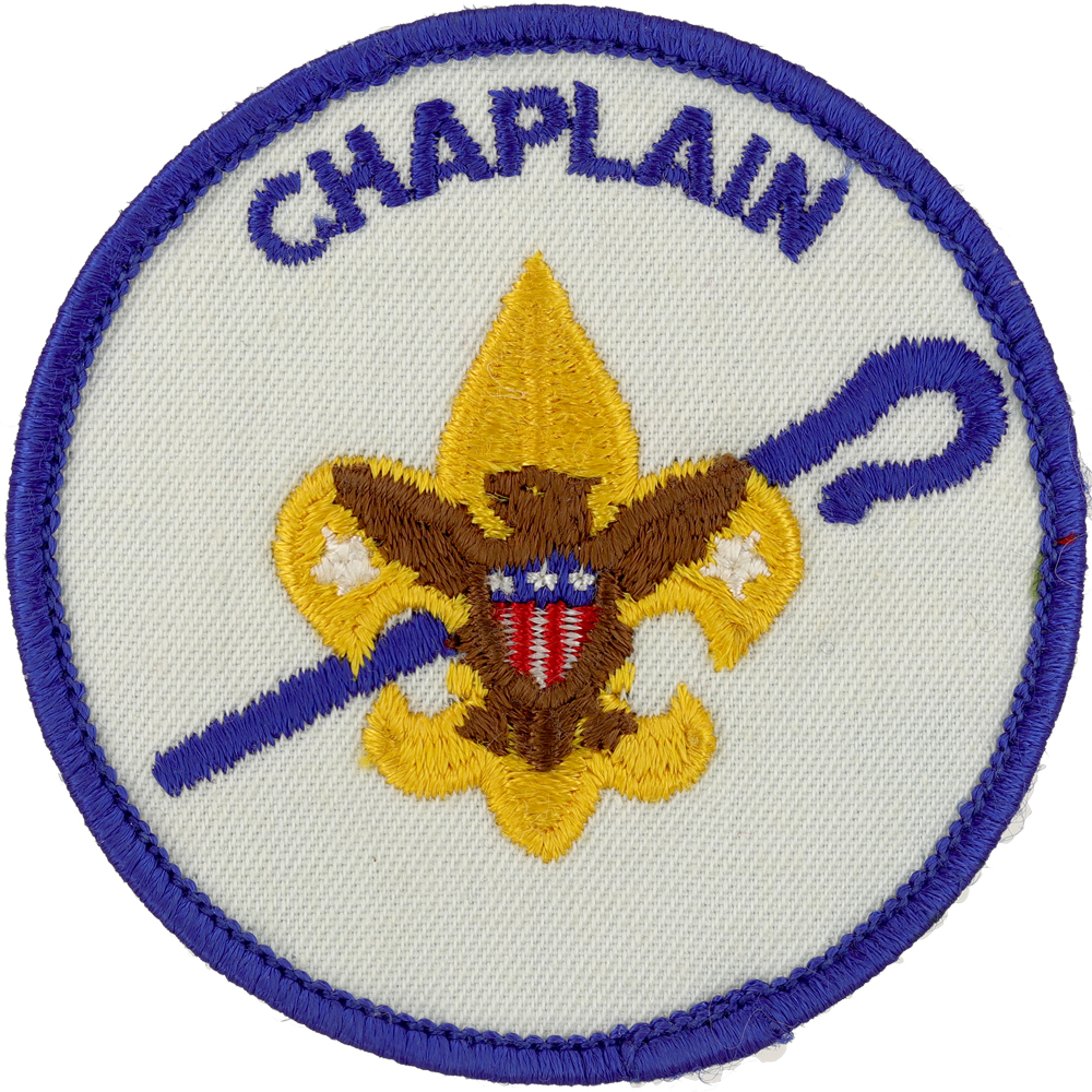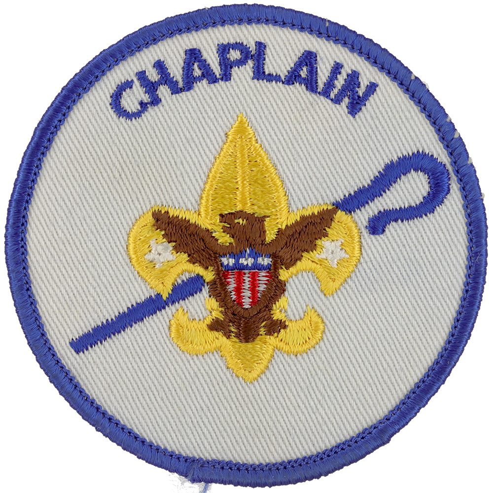 - Design: Gold Tenderfootemblem with brown eagle, blue shpherd's crook, blue border and blettering "CHAPLAIN"