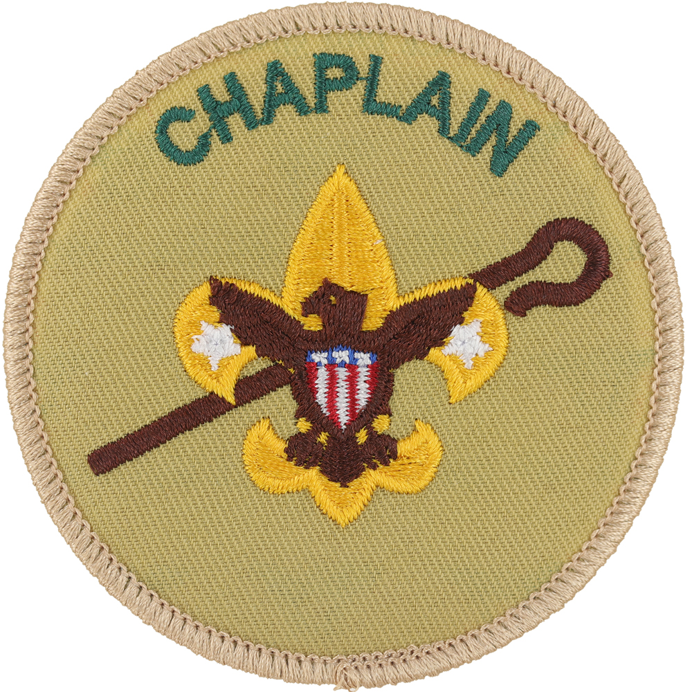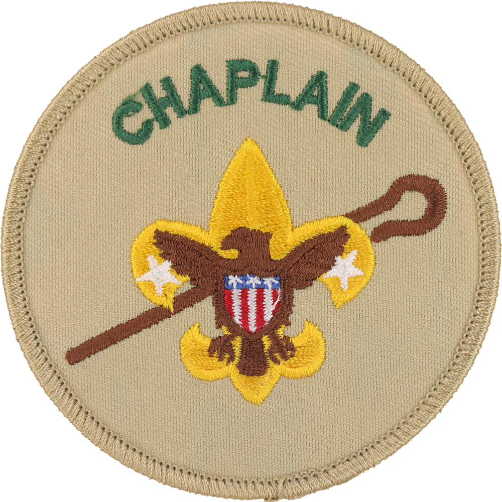 - Design: Gold Tenderfoot emblem with brown eagle, brown shepherd's crook, tan border, green lettering "CHAPLAIN", eagle tail feathers bottom flat