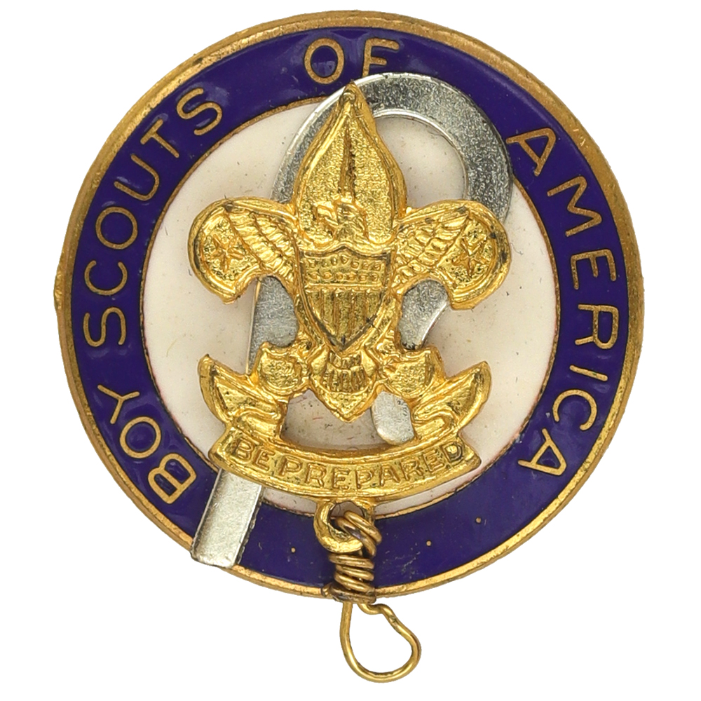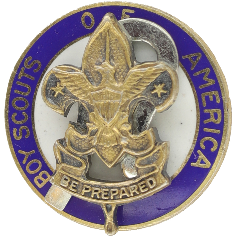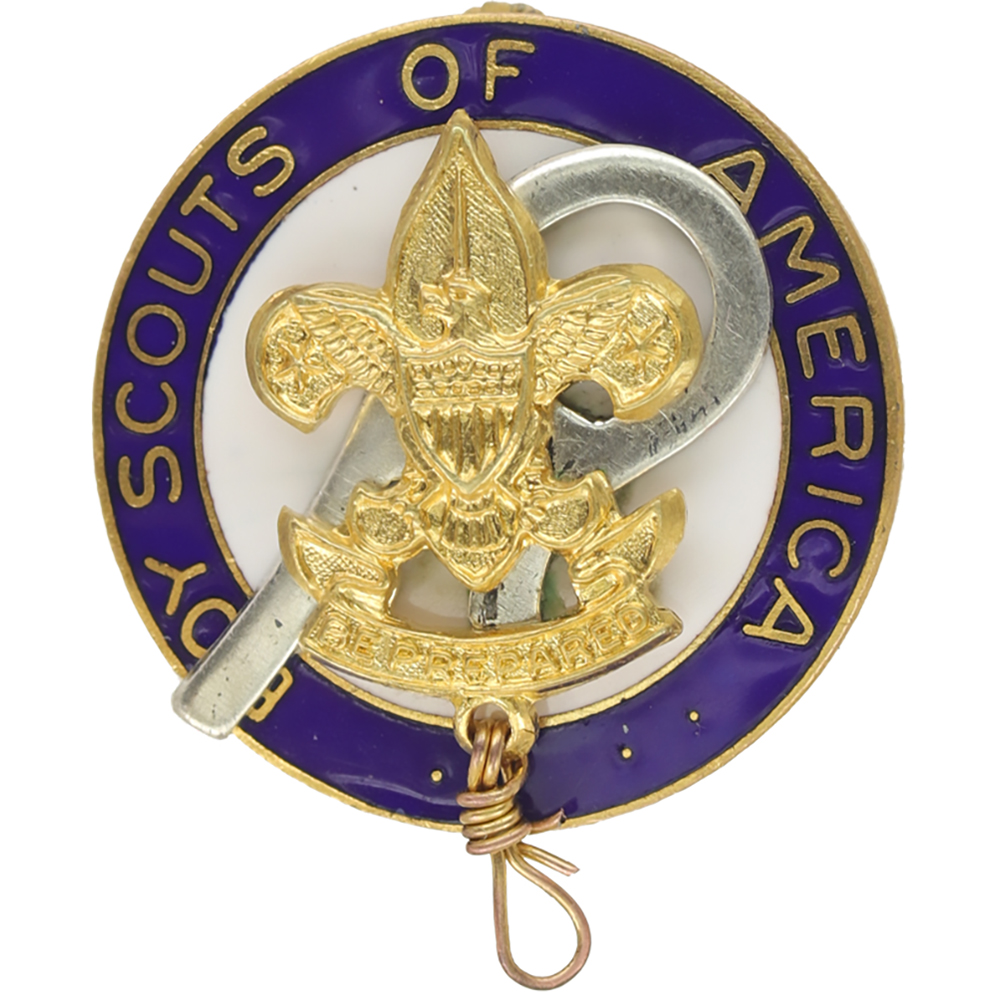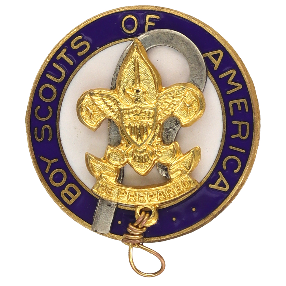 - Design: Stylized fdl arms, closed beak, 13 stars in shield, 3 dimensional tall crown gold first class, gold "BOY SCOUTS OF AMERICA", silver shepherd's crook, 4 large gold dots below fdl