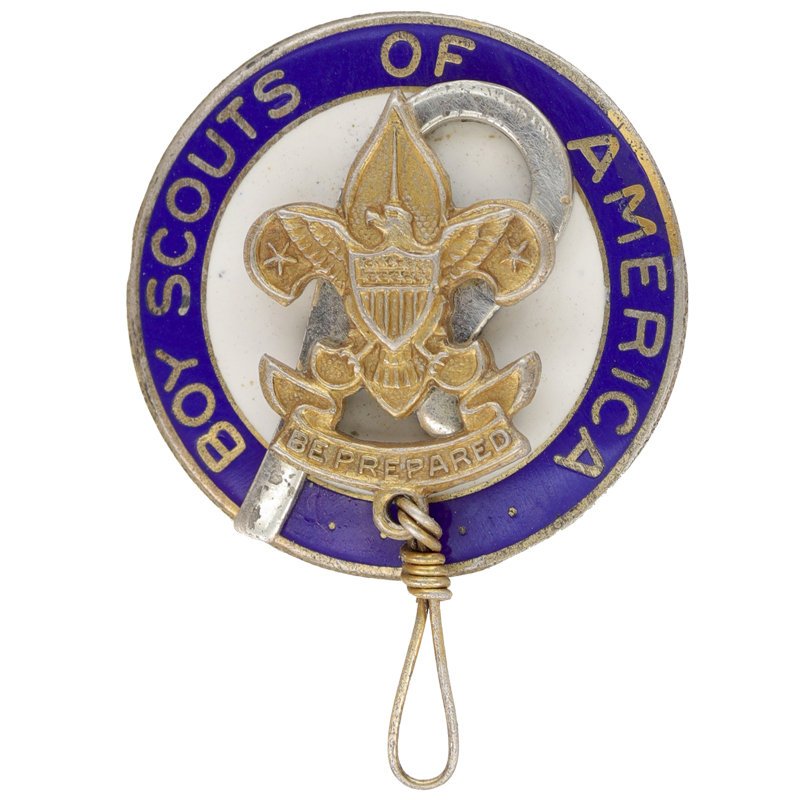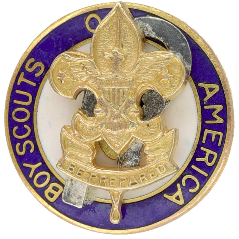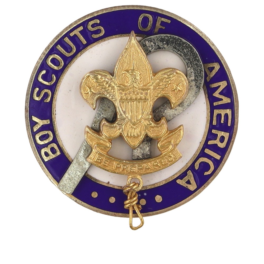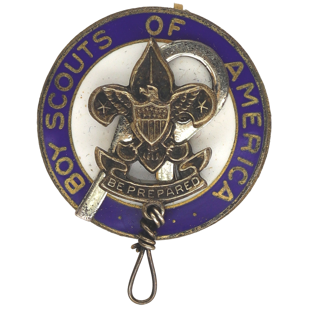 - Design: Stylized fdl arms, closed beak, 13 stars in shield, 3 dimensional tall crown gold first class, gold "BOY SCOUTS OF AMERICA", silver shepherd's crook, 4 large gold dots below fdl