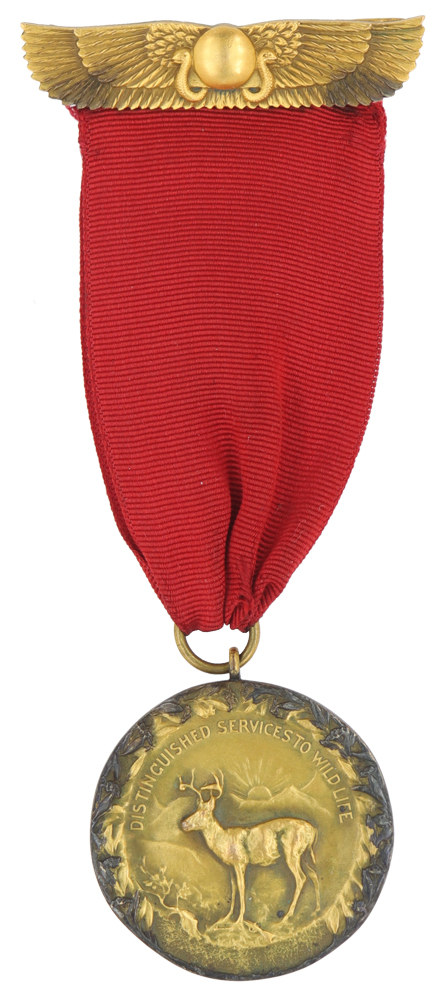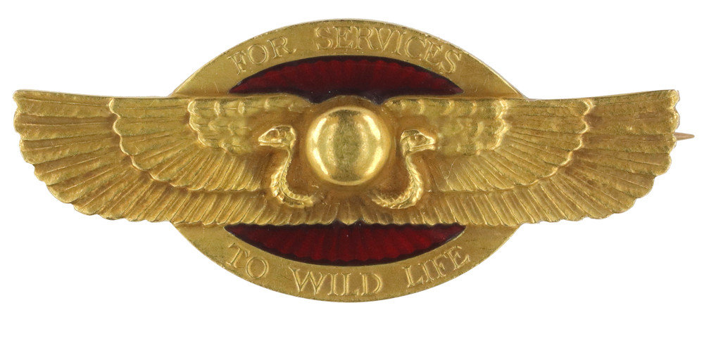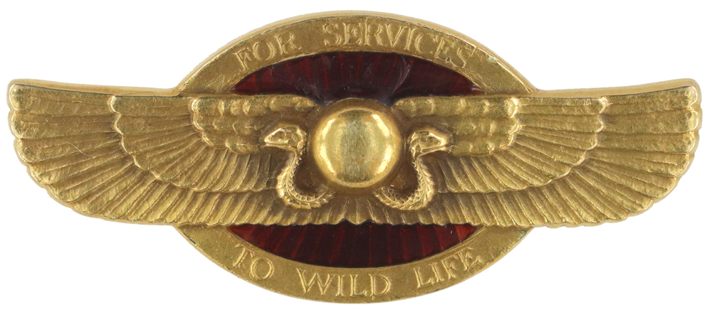 Design: Oval with extended wings, two snakes pointing outward, raised lettering "FOR SERVICES TO WILD LIFE"
