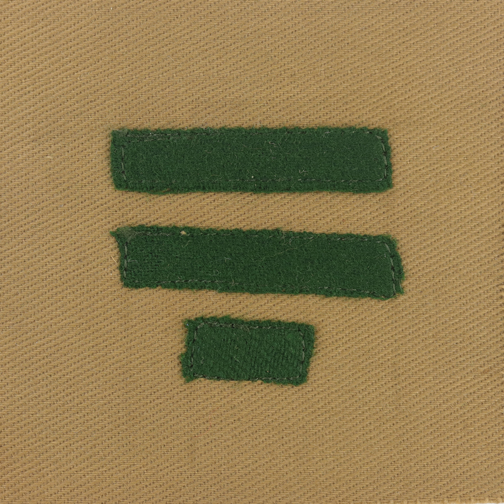 - Emblem: 46mm including knot, gold squatty crown 1st class with brown eagle, near vertical stitched smile, 5.5mm width bars
