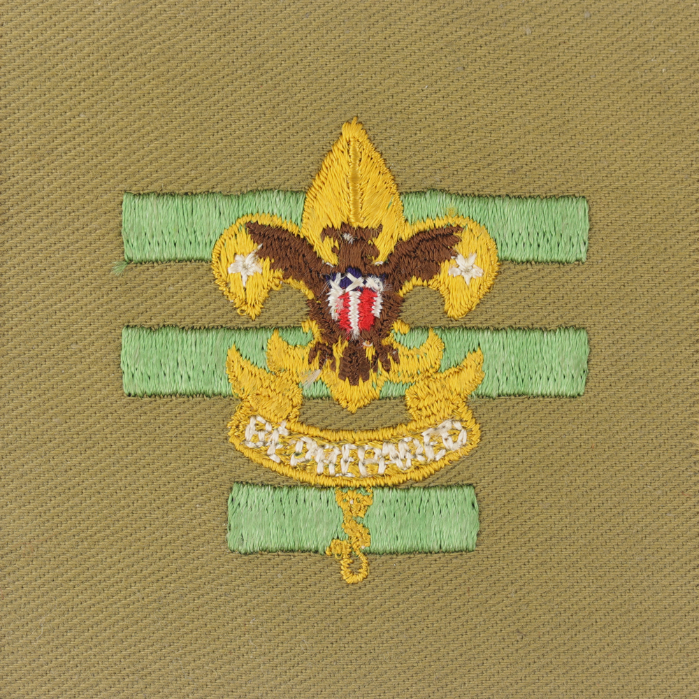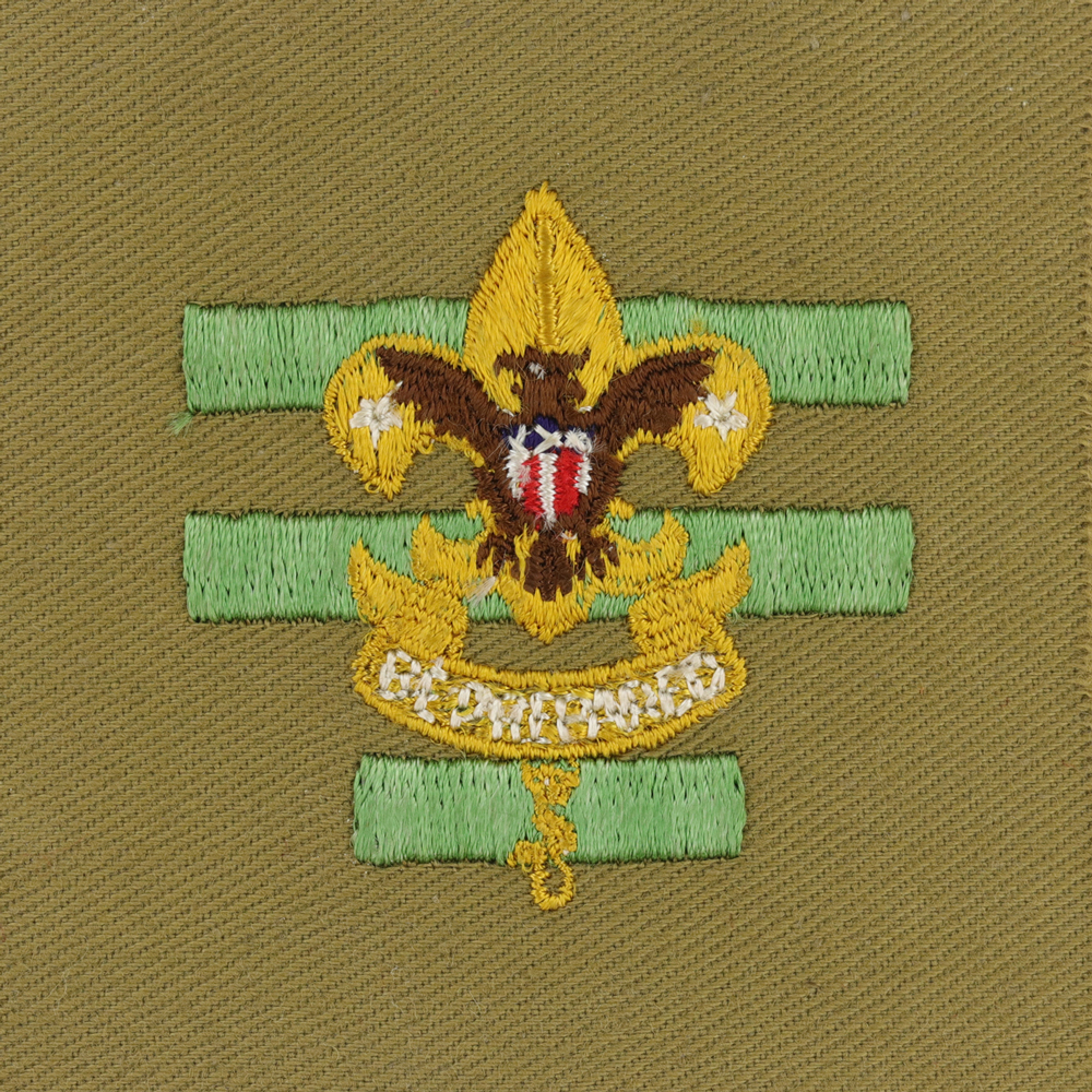 - Emblem: 49mm including knot, gold tall crown 1st class with brown eagle, horizontal stitched smile, 7mm bar width