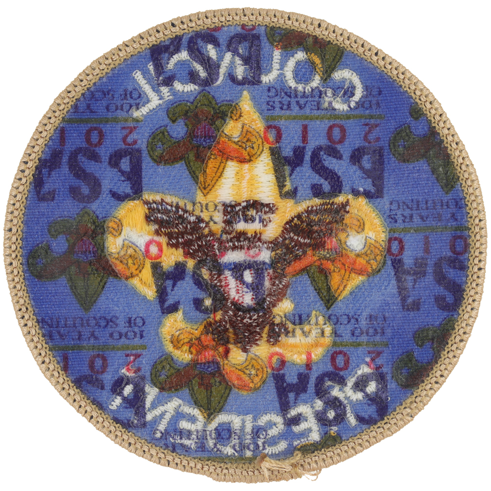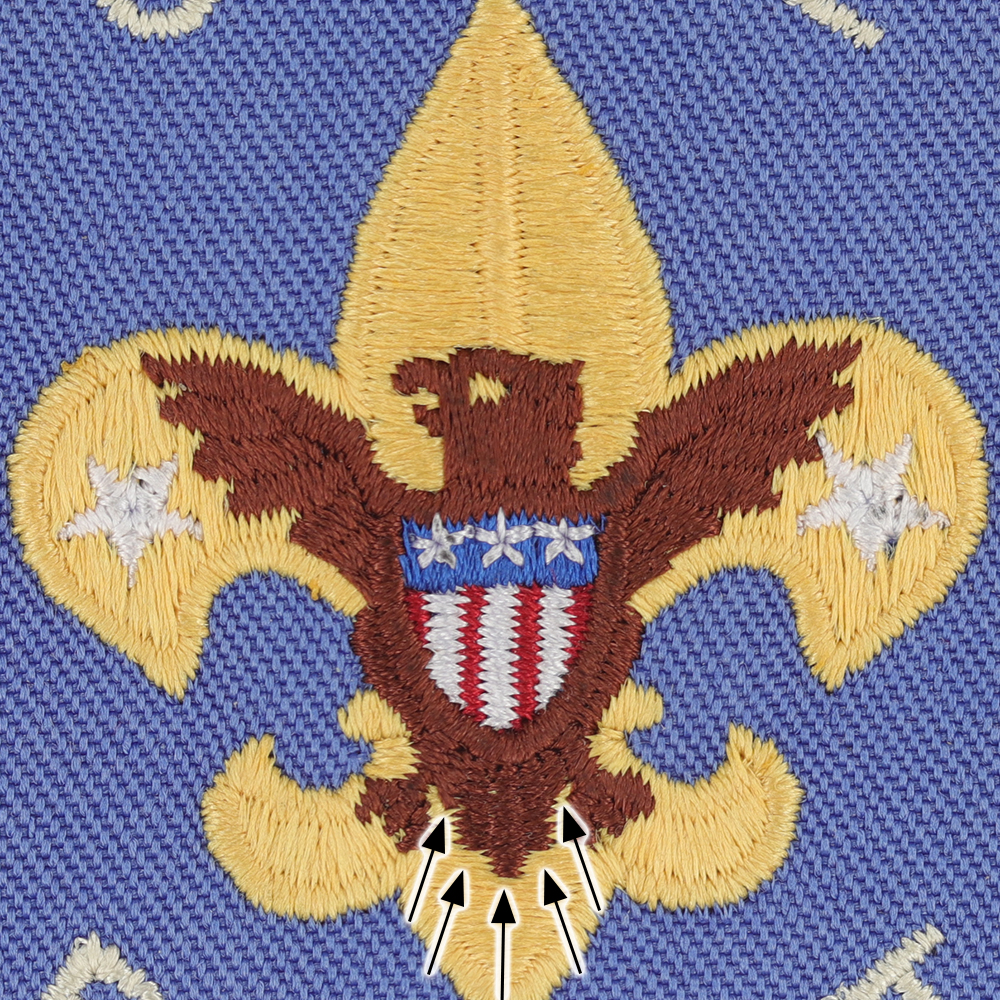 - Design: Gold Tenderfoot emblem with brown eagle, light brown border, three tail feathers