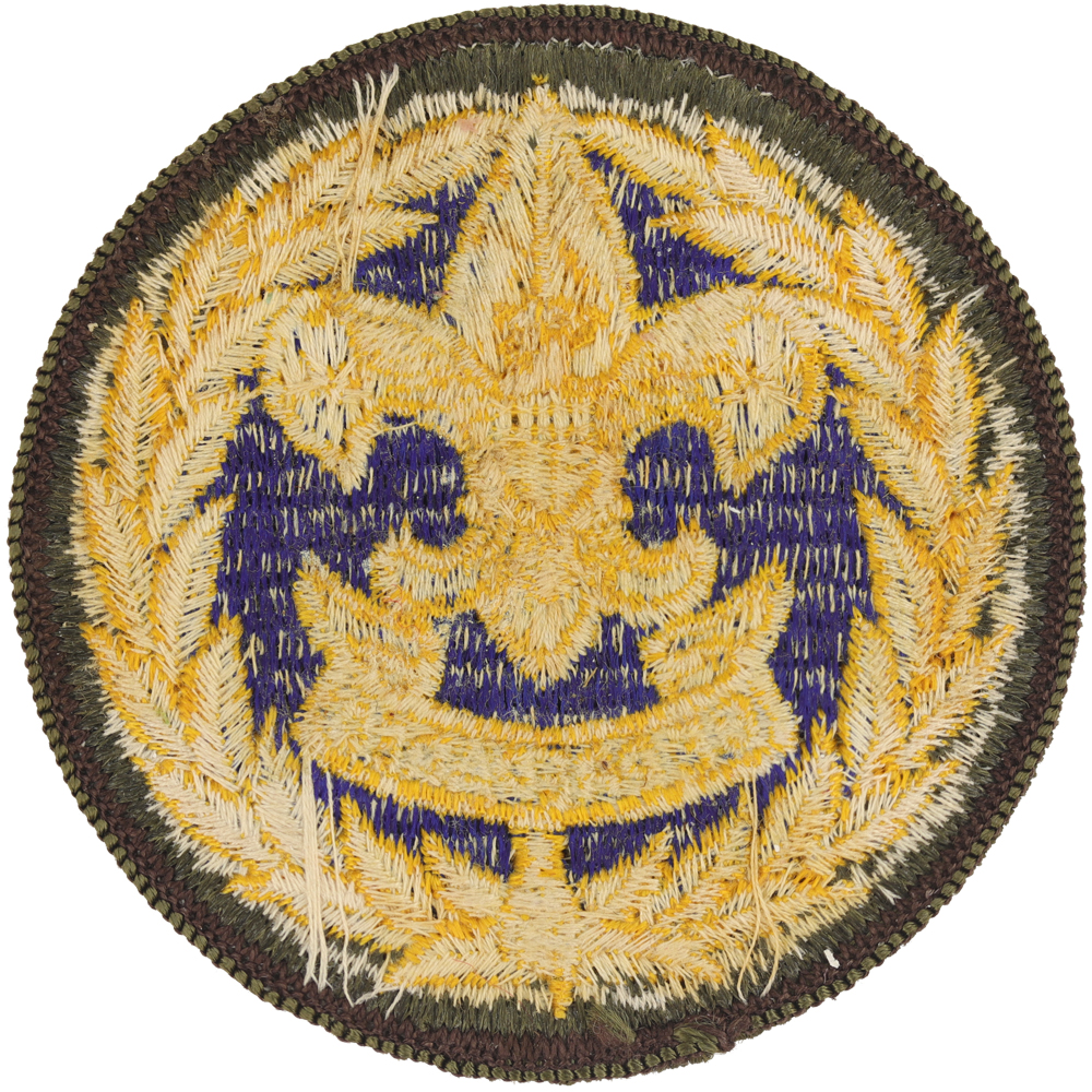 - Design: Heavy gold wreath, gold outline on high crown First Class, 1 gold hand pointing down, gold eagle, gold First Class badge, blue background