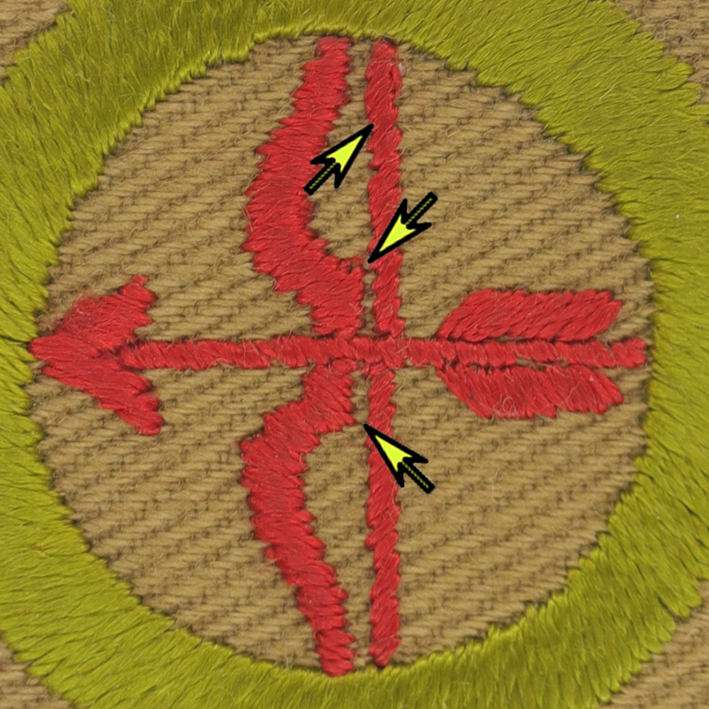 - Design: Bow squared where arrow crosses, bow string embroidery is downward left to right