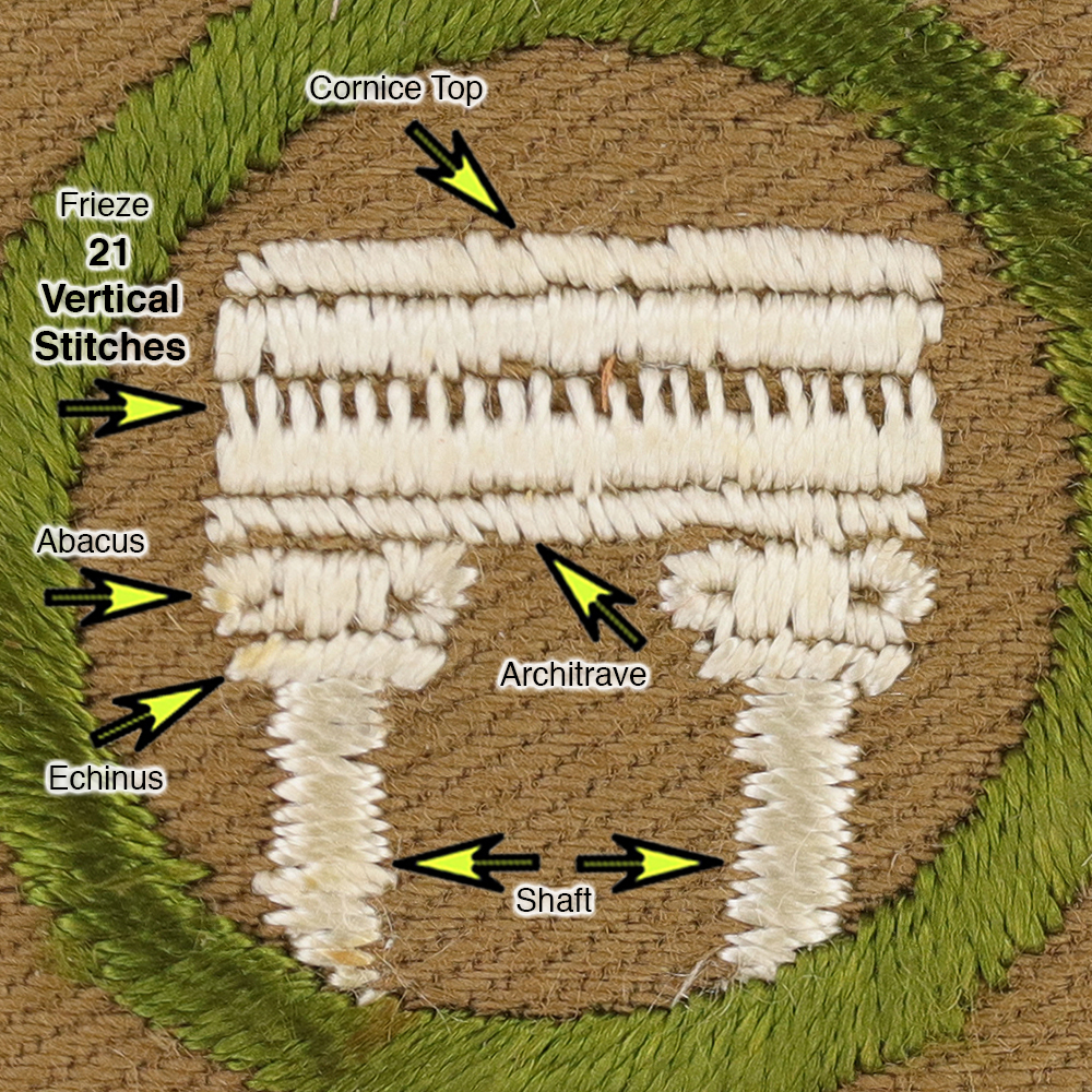 - Design: Entlablature: Top of cornice embroidery angles downward left to right, frieze has 21 vertical stitches, architrave embroidery angles downward left to right. Column: Abacus center is vertical embroidery, abacus ends are loops, echinus embroidery angles upward left to right, thin shaft