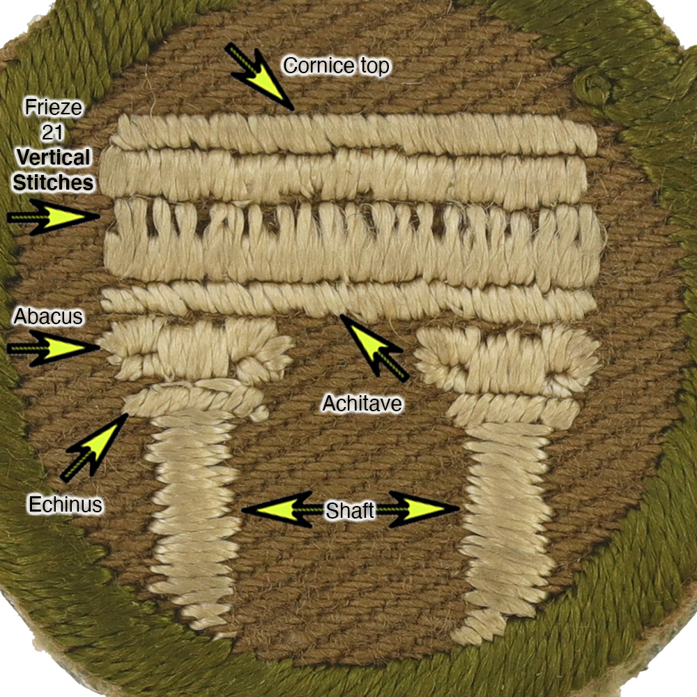 - Design: Entlablature: Top of cornice embroidery vertical, frieze has 21 vertical stitches, architrave embroidery downward left to right. Column: Abacus center is vertical embroidery, abacus ends are loops, echinus embroidery angles upward left to right, thin shaft