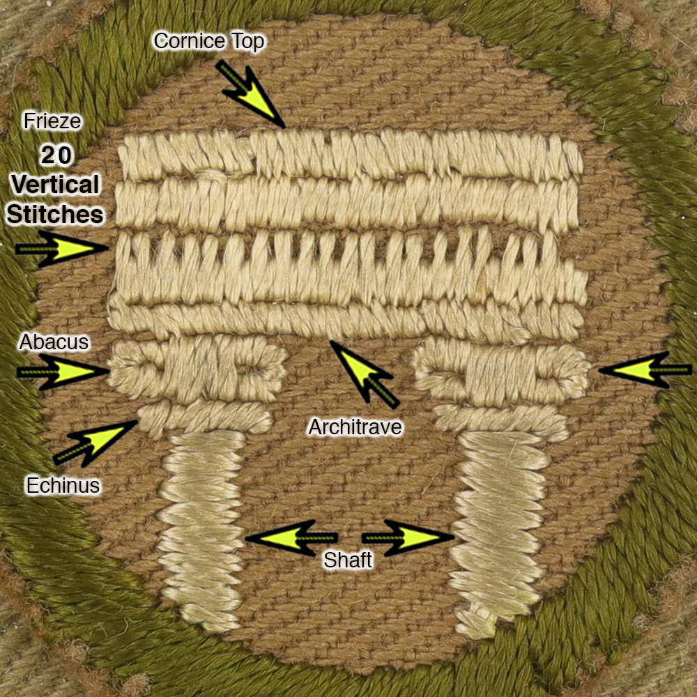 - Design: Entlablature: Top of cornice embroidery angles downward left to right, frieze has 20 vertical stitches, architrave embroidery downward left to right. Column: Abacus center is vertical embroidery, abacus ends are loops, echinus embroidery angles upward left to right, thin shaft