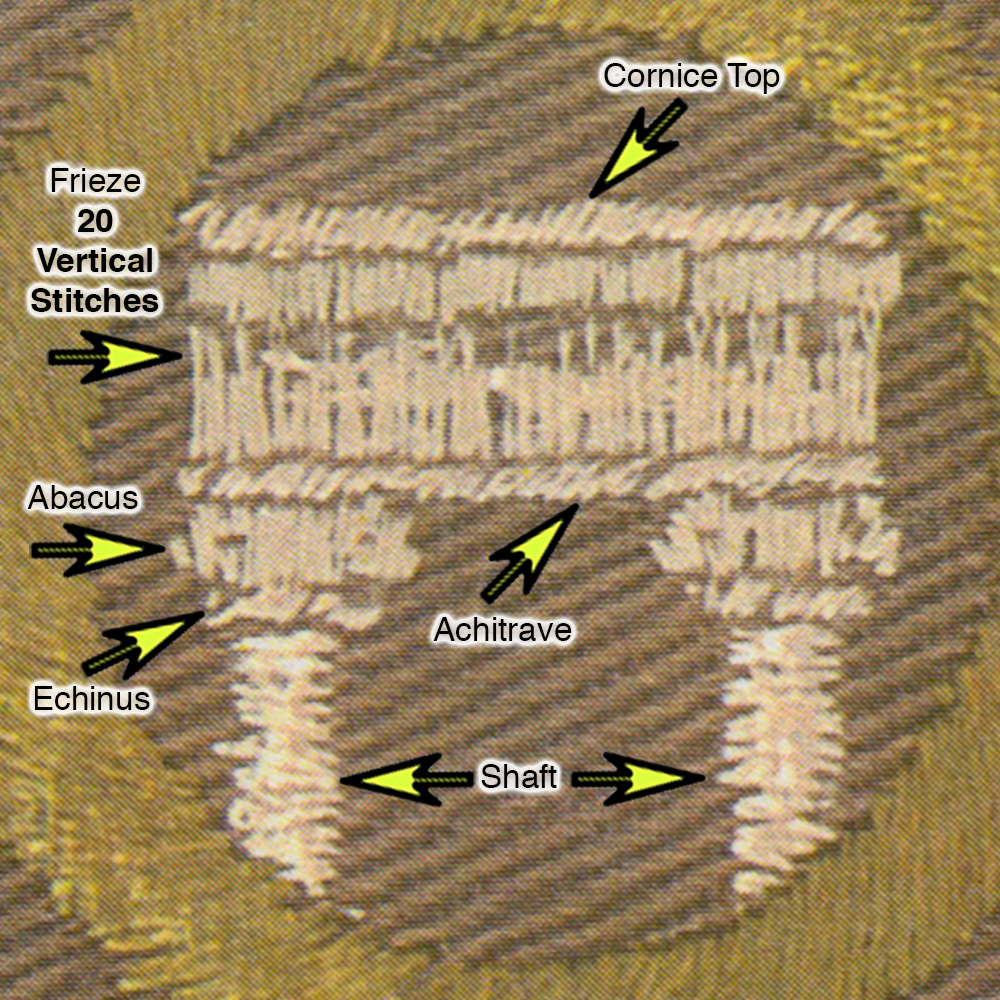 - Design: Entlablature: Top of cornice embroidery angles upward left to right, frieze has 20 vertical stitches, architrave embroidery angles upward left to right. Column: Abacus center is vertical embroidery, abacus ends angled outward, echinus embroidery angles upward left to right, medium shaft