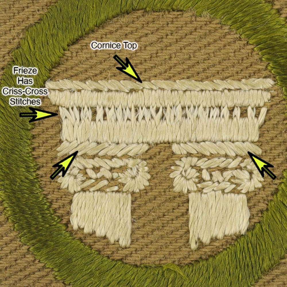 - Design: Top of Cornice embroidery angled downward left to right, top of left pillar embroidery is upward left to right, top of right pillar embroidery is downward left to right, frieze has criss-cross threads