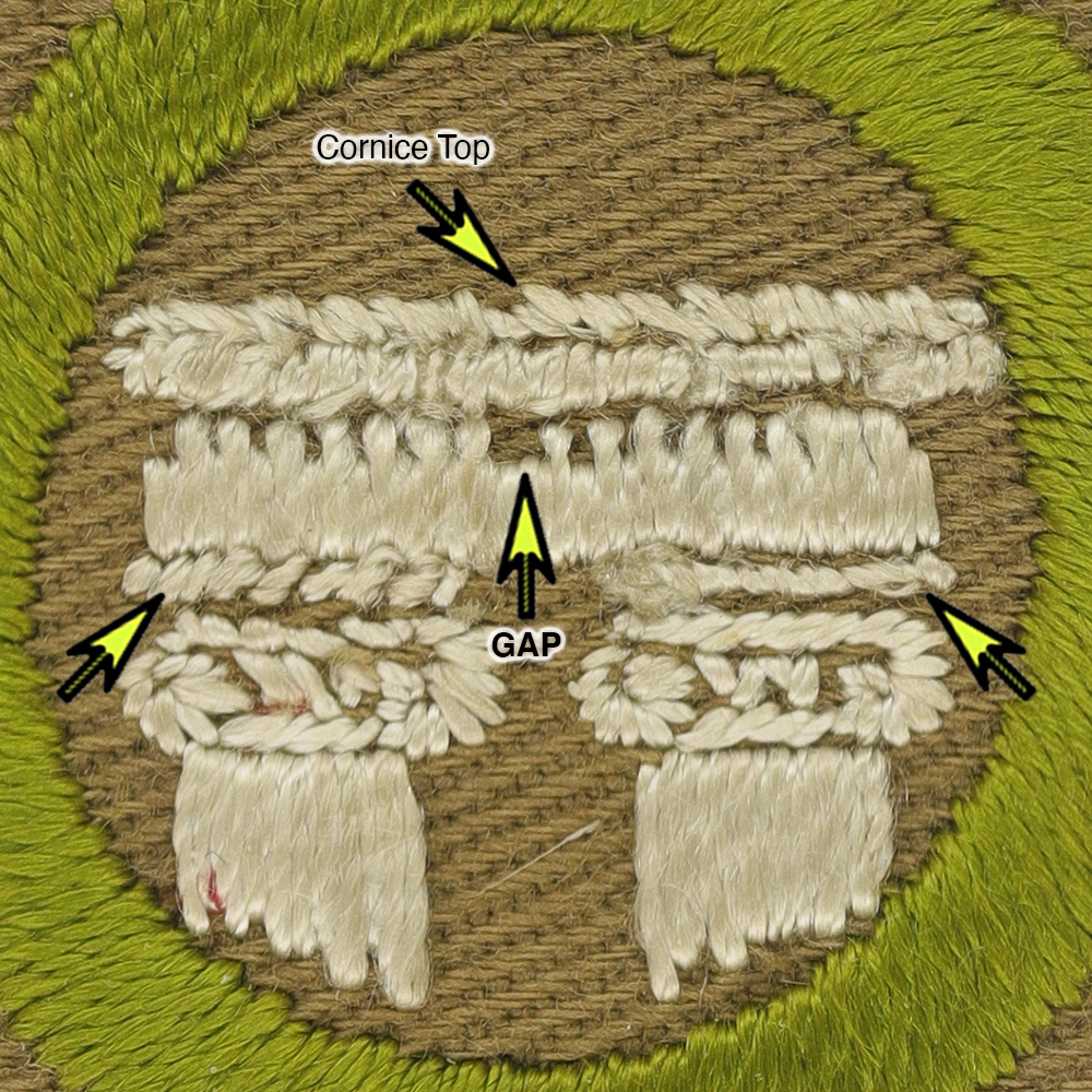 - Design: Cornice embroidery messy, top of Cornice embroidery angled downward left to right, top of left pillar embroidery is upward left to right, top of right pillar embroidery is downward left to right, Frieze has a gap in the center