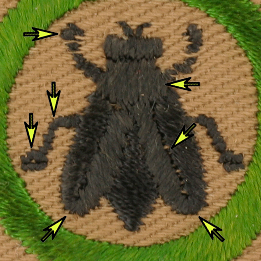 - Design: Large thorax, center groove in each wing, two 80 degree bends in legs, rounded bottom to wings, blobs at end of each leg