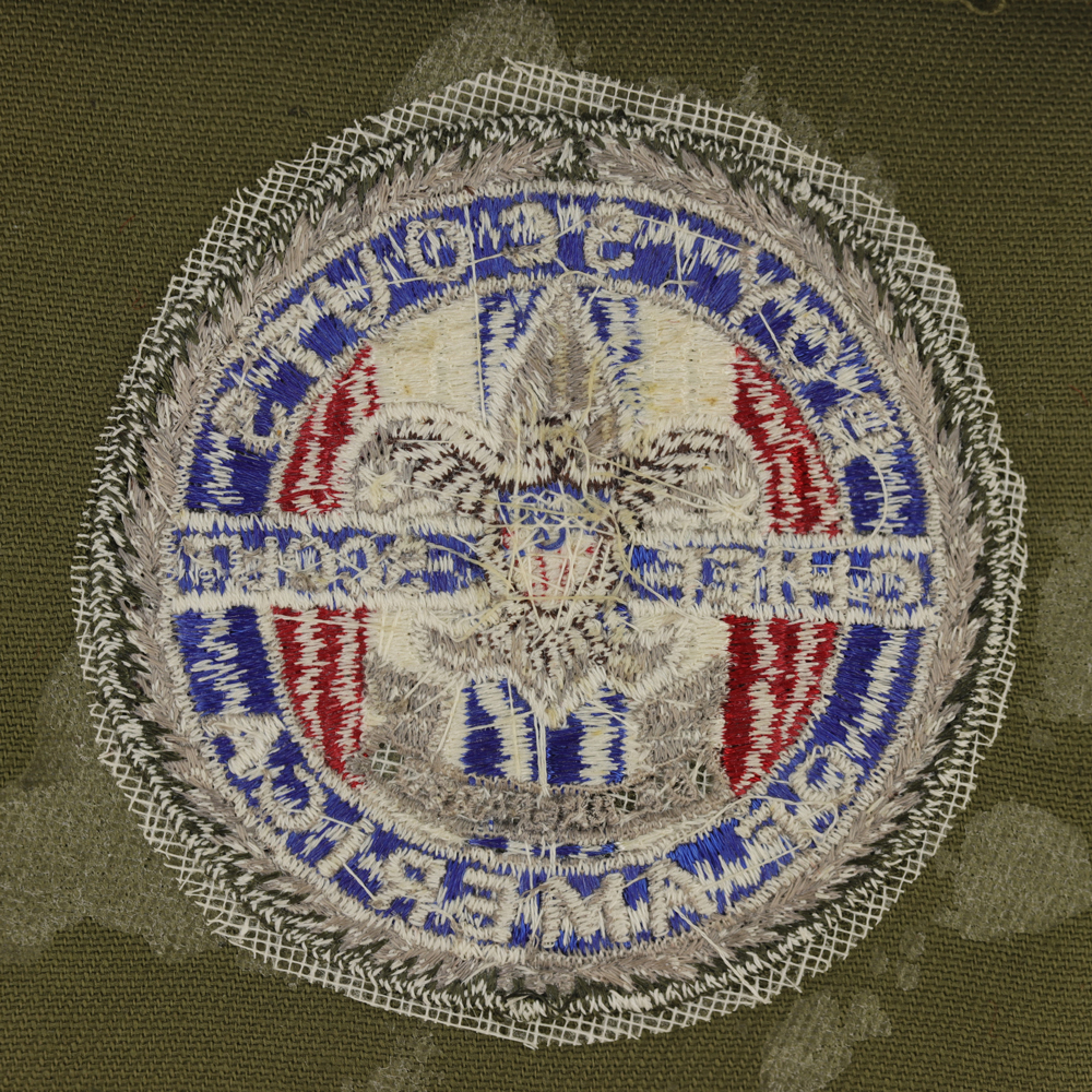 - Design: Silver First Class with brown eagle, red-white-blue-white-red behind First class emblem, blue outer ring with silver "BOY SCOUTS OF AMERICA", blue crossbar with silver "CHIEF SCOUT"