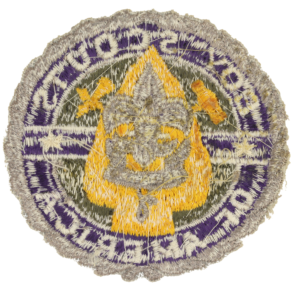 - Design: Gold arrowhead, mallet & Roman axe, silver First Class enblem with silver eagle, 1 white star each side, silver "BOY SCOUTS OF AMERICA", purple behind lettering
