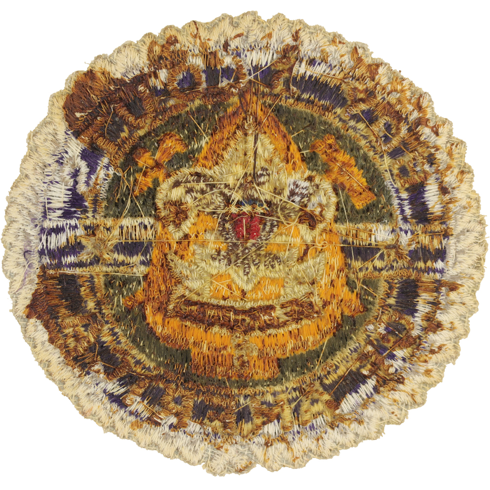 - Design: Gold arrowhead, mallet & Roman axe, silver First Class enblem with brown eagle, hands pointing to sides, 1 silver star each side, silver "BOY SCOUTS OF AMERICA", purple behind lettering