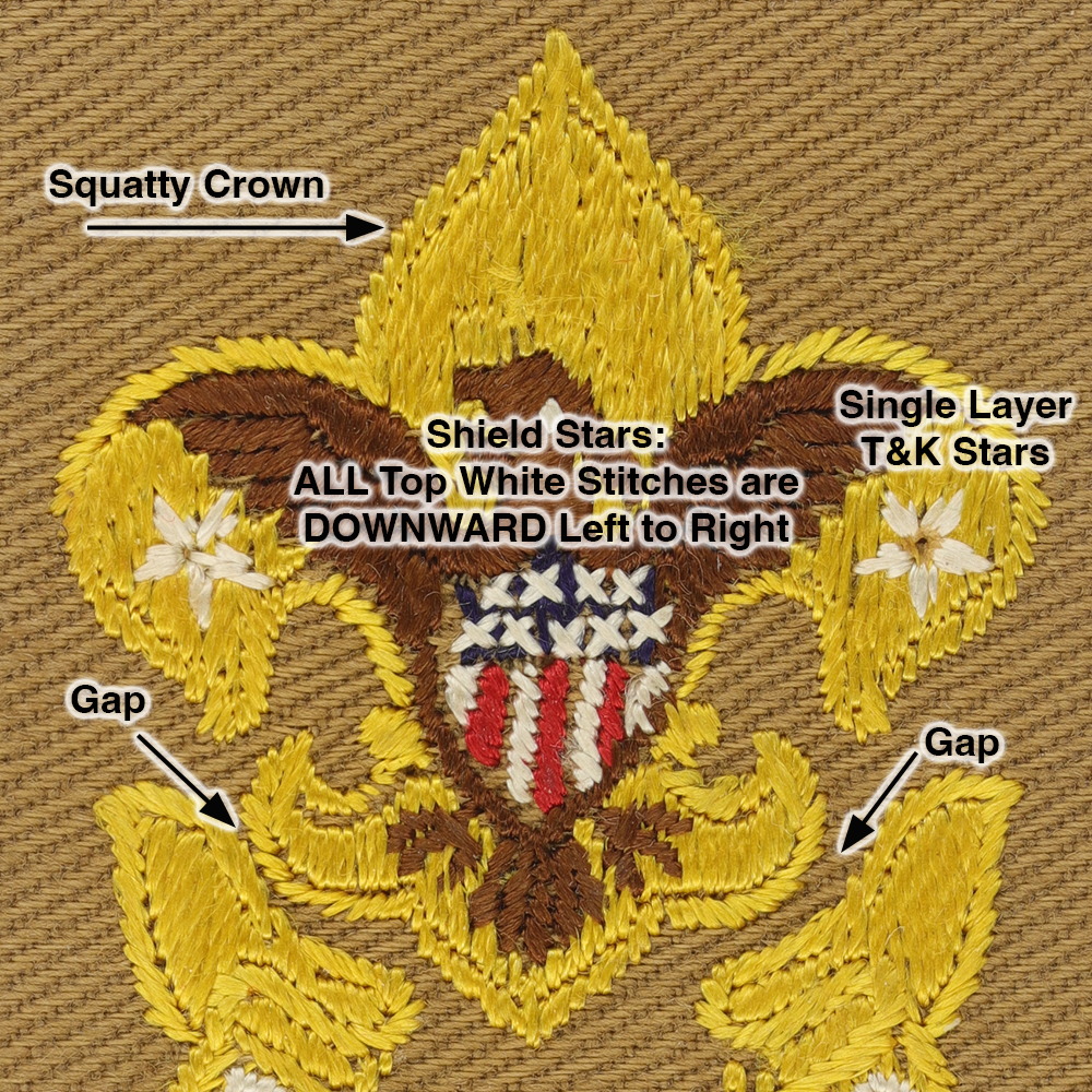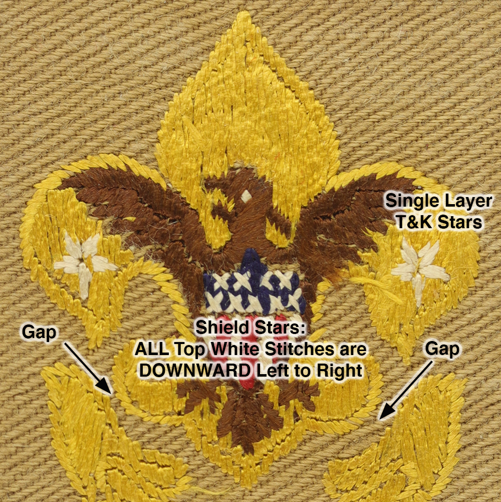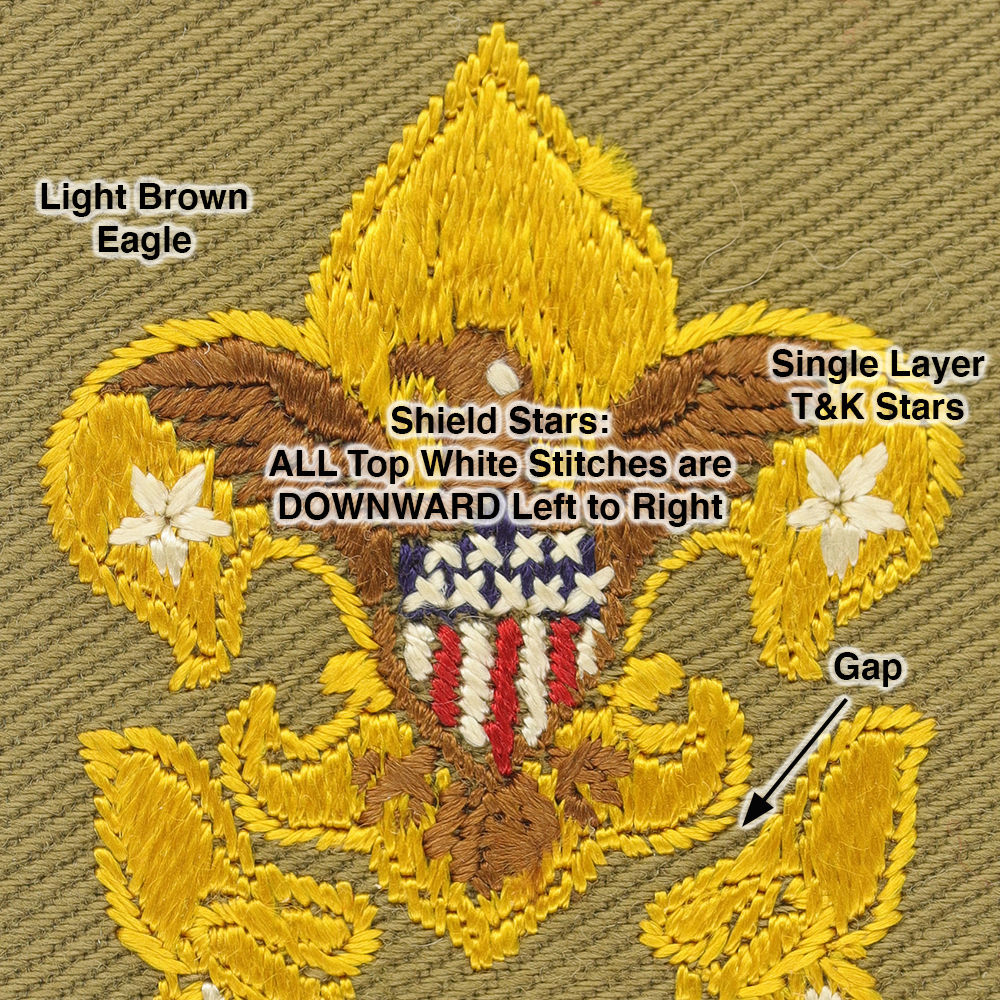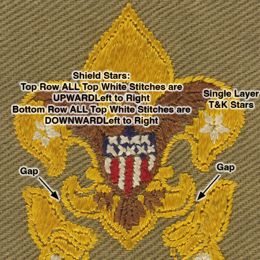 - Minor variation: Dark brown eagle, all shield stars top white stitches are DOWNWARD left to right, 3 red stripes