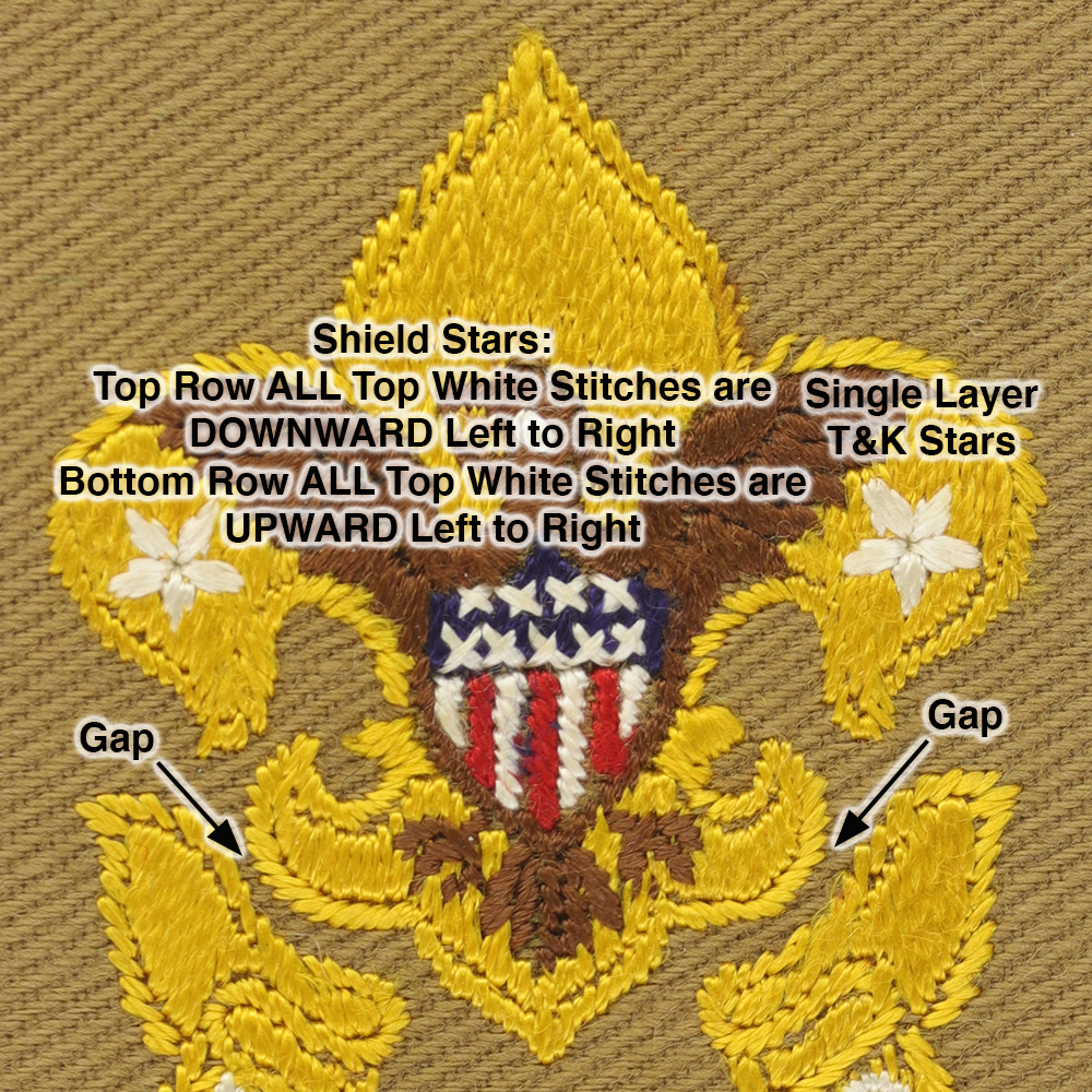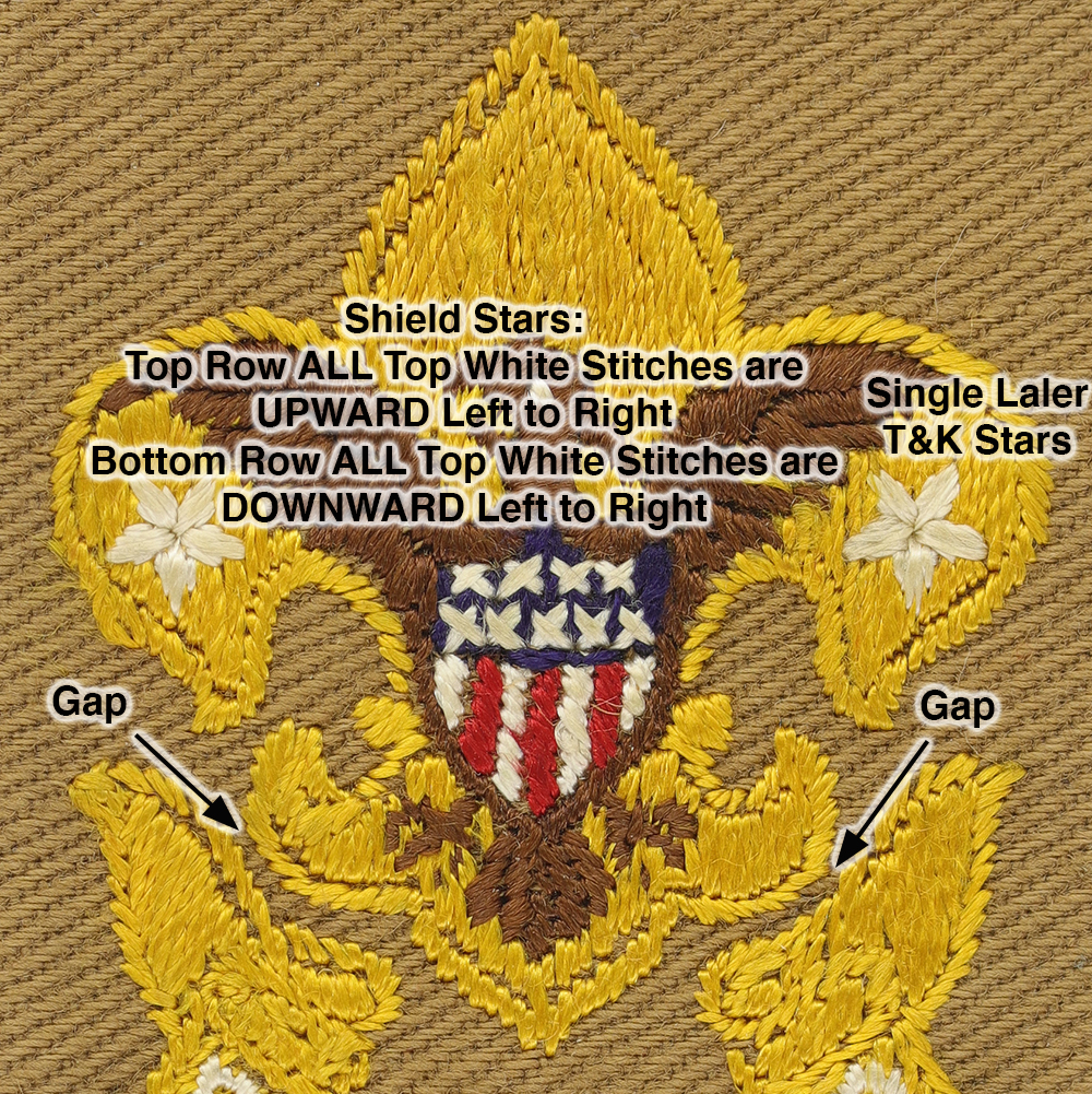 - Minor variation: Dark brown eagle, all shield stars top white stitches are UPWARD left to right