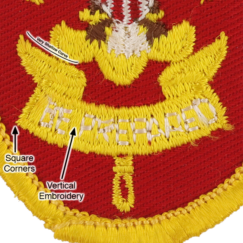 - Shield: Border is single white stitch, white stitch separates red and blue in shield