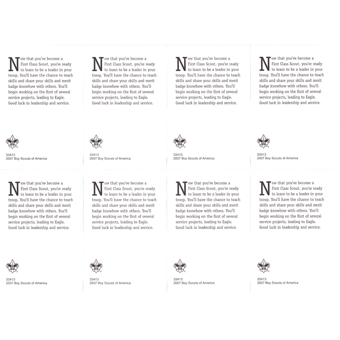 - Printing: 4 color, tan background First Class badge