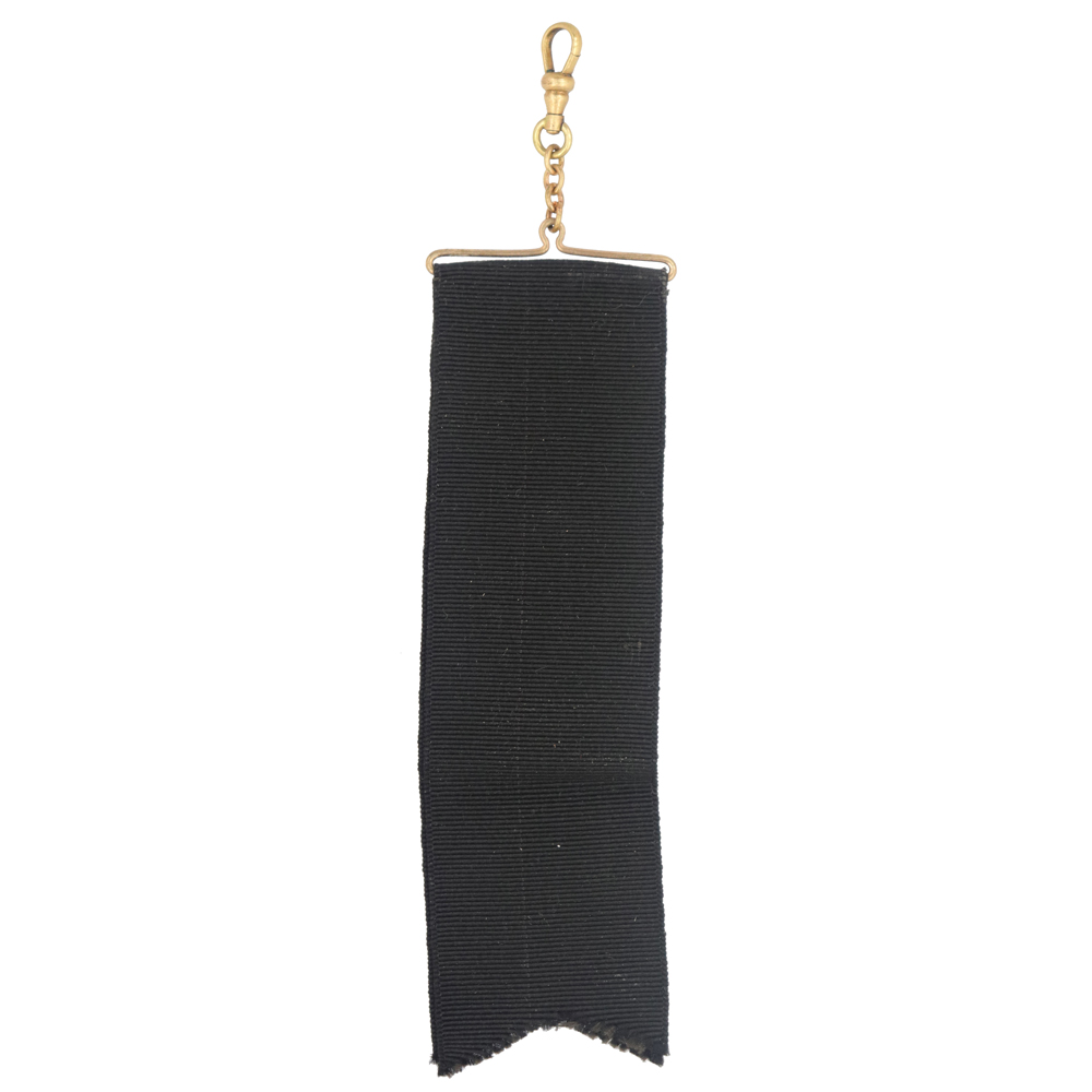 - Heavy grosgrain silk ribbon, First Class emblem, polished gilded medal fob, gold chain and clasp
