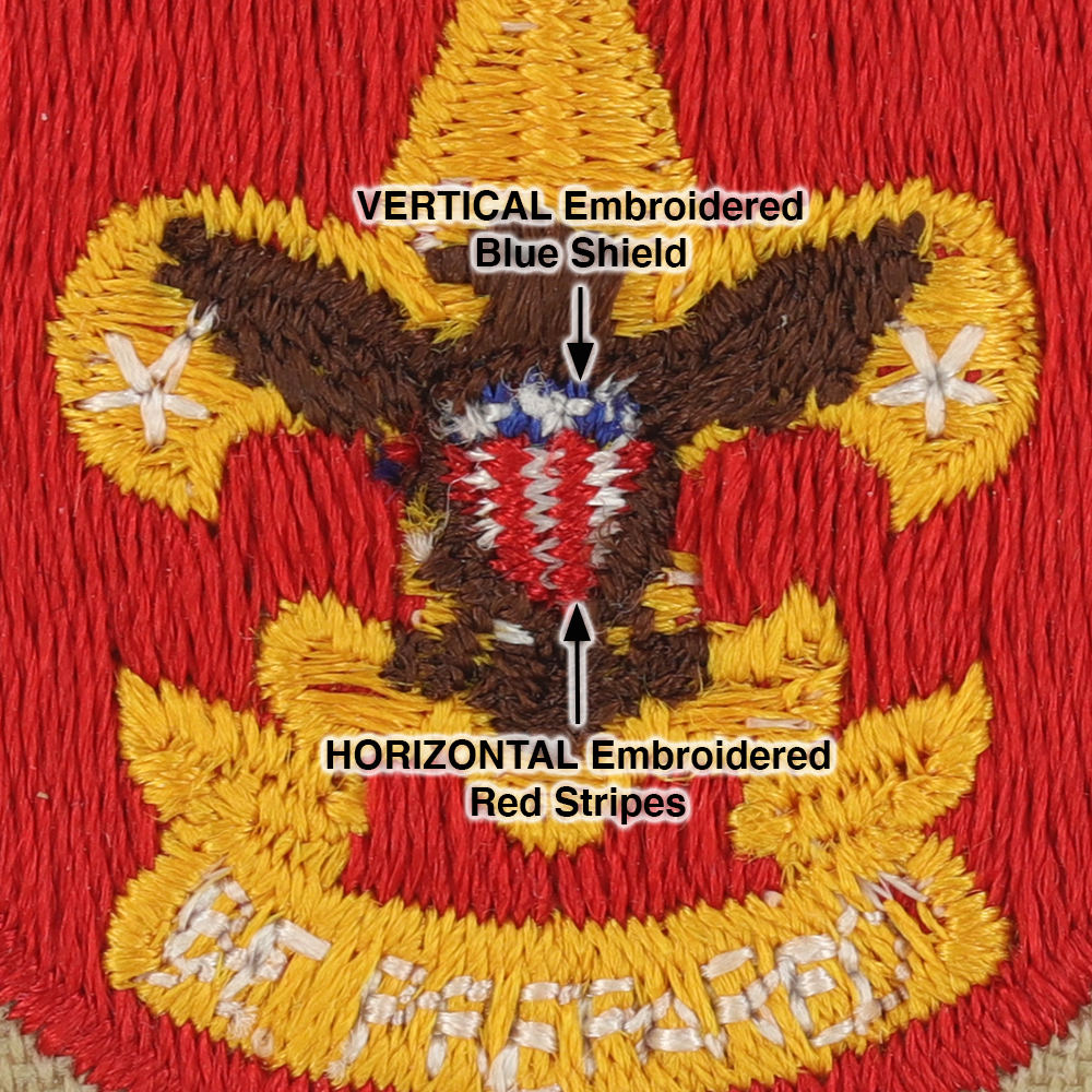 - Shield: VERTICAL blue, HORIZONTAL red embroidery