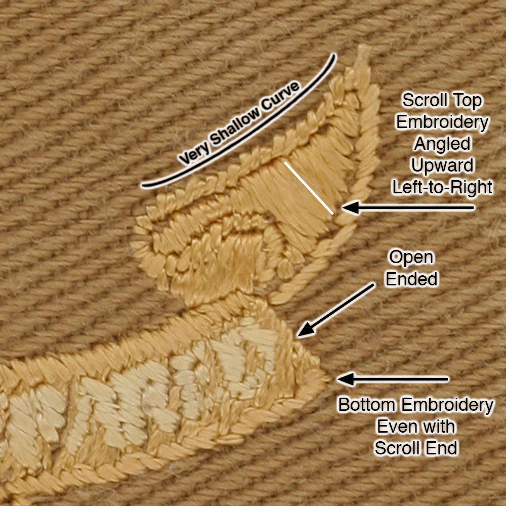 - Scroll Left: Very shallow concave curved scroll top, ribbon embroidery angled upward right-to-left, open ended smile, bottom embroidery even with scroll end