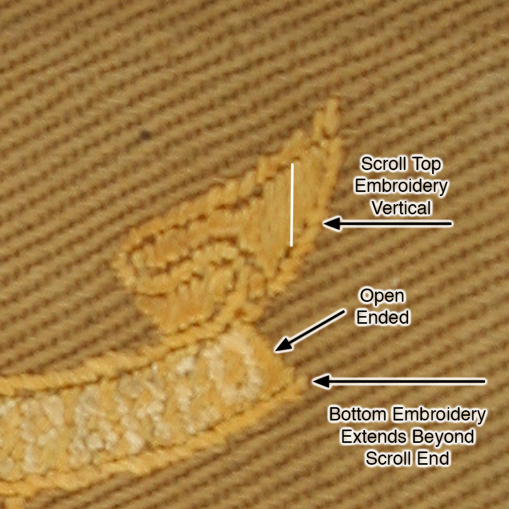- Scroll Right: Very shallow concave curved scroll top, scroll top embroidery vertical, open ended smile, bottom embroidery extends beyond scroll end