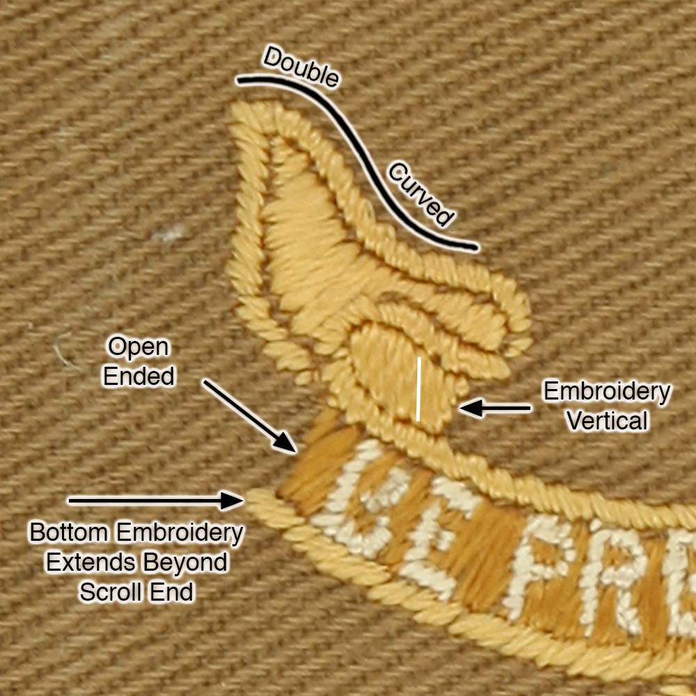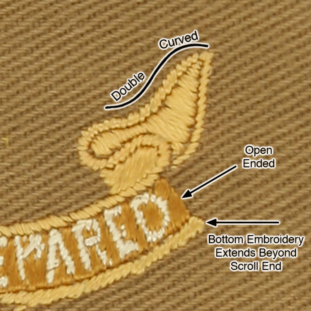 - Scroll Left: Double curved scroll top, ribbon embroidery angled upward right-to-left, open ended smile, bottom embroidery even with scroll end, 2 color