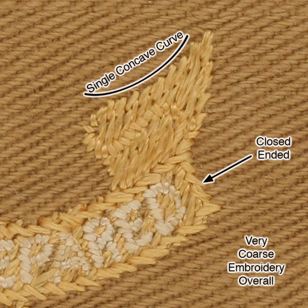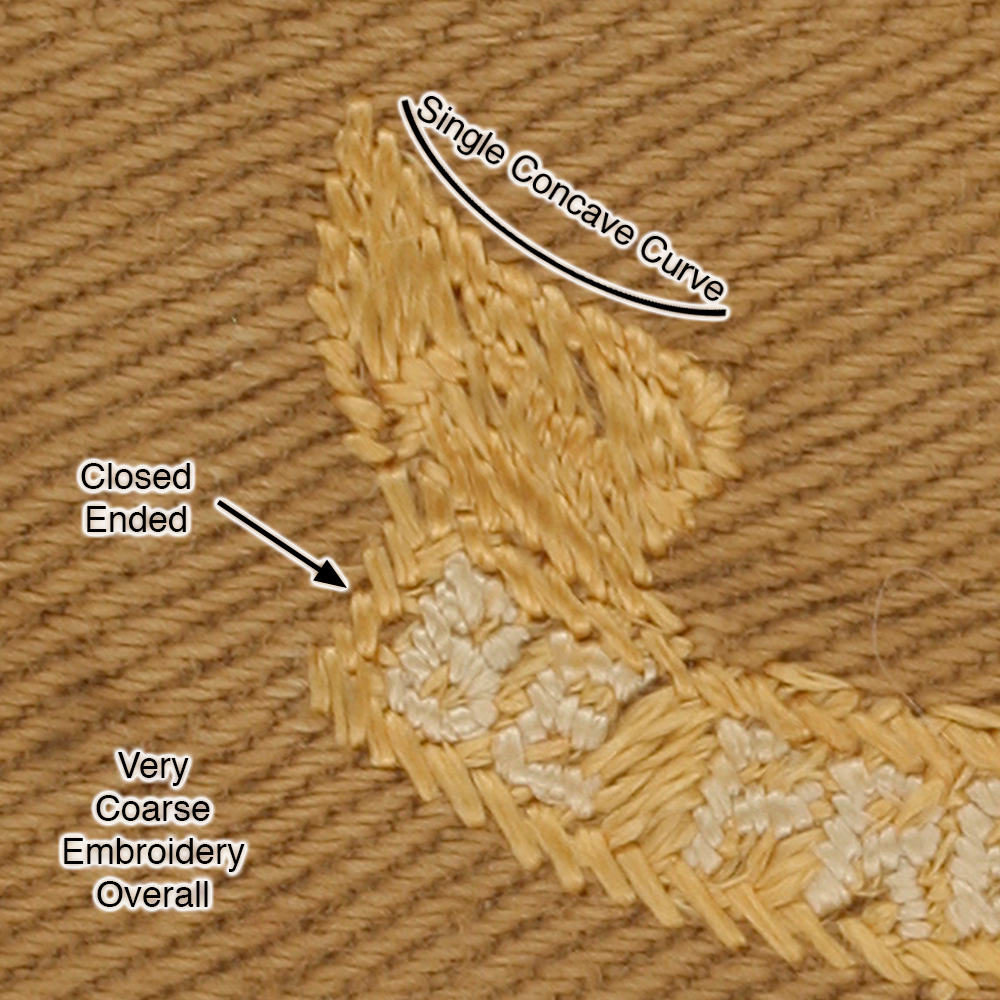- Scroll Right: Single concave curved scroll top, closed ended smile, very coarse embroidery