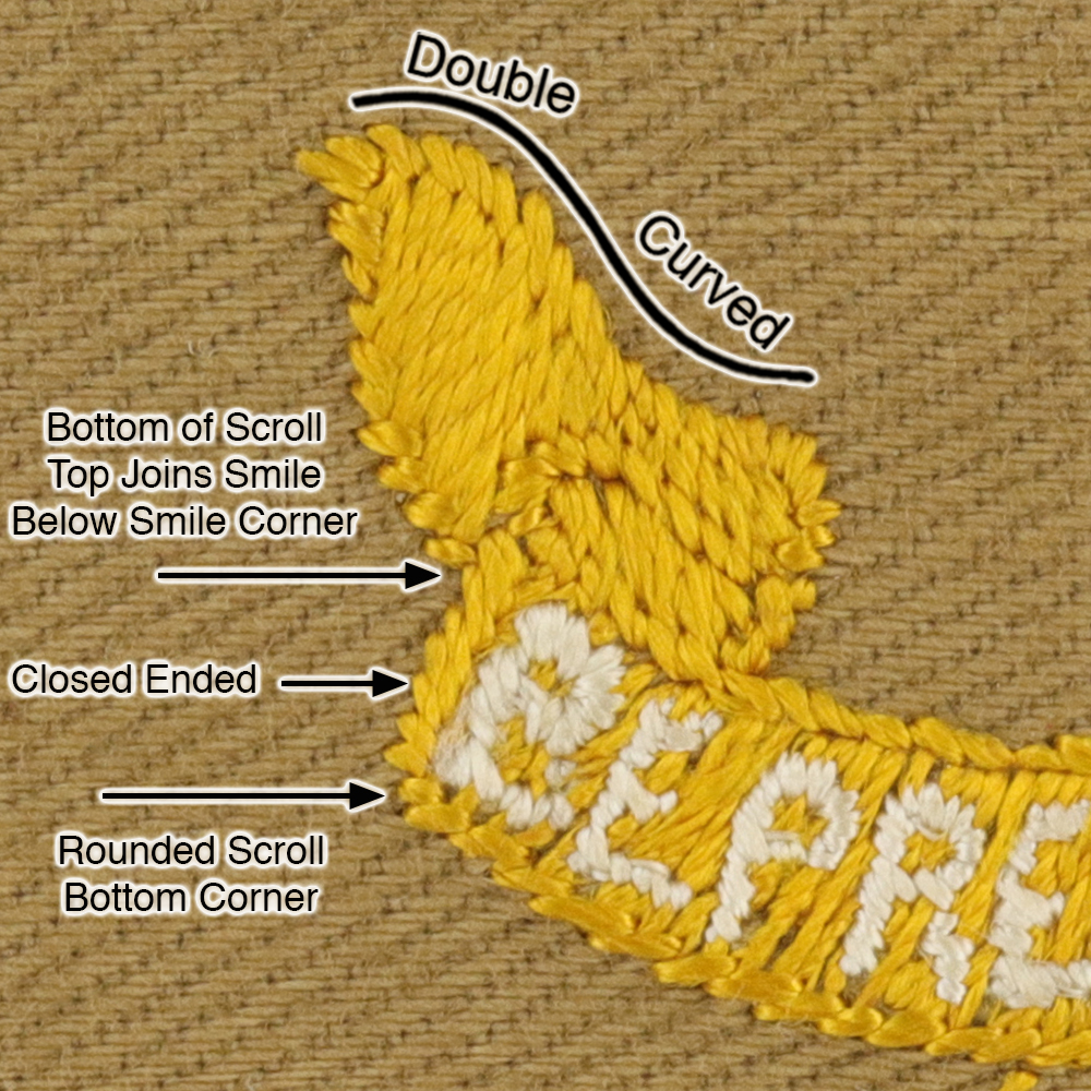 - Scroll Left: Double curved scroll tops, bottom of scroll top joins smile below smile corner, closed ended smile, rounded scroll bottom corner