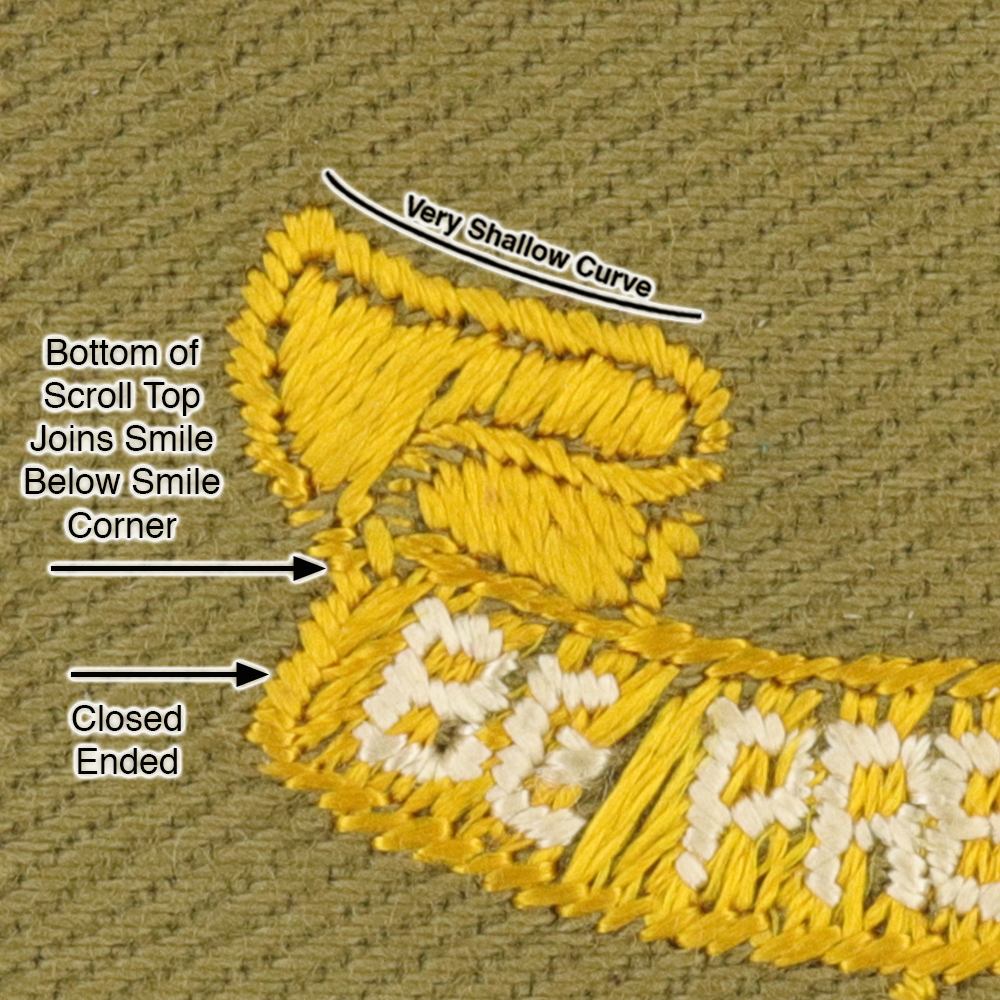 - Scroll Left: Very shallow concave curved scroll tops, bottom of scroll top joins smile below smile corner, closed ended smile